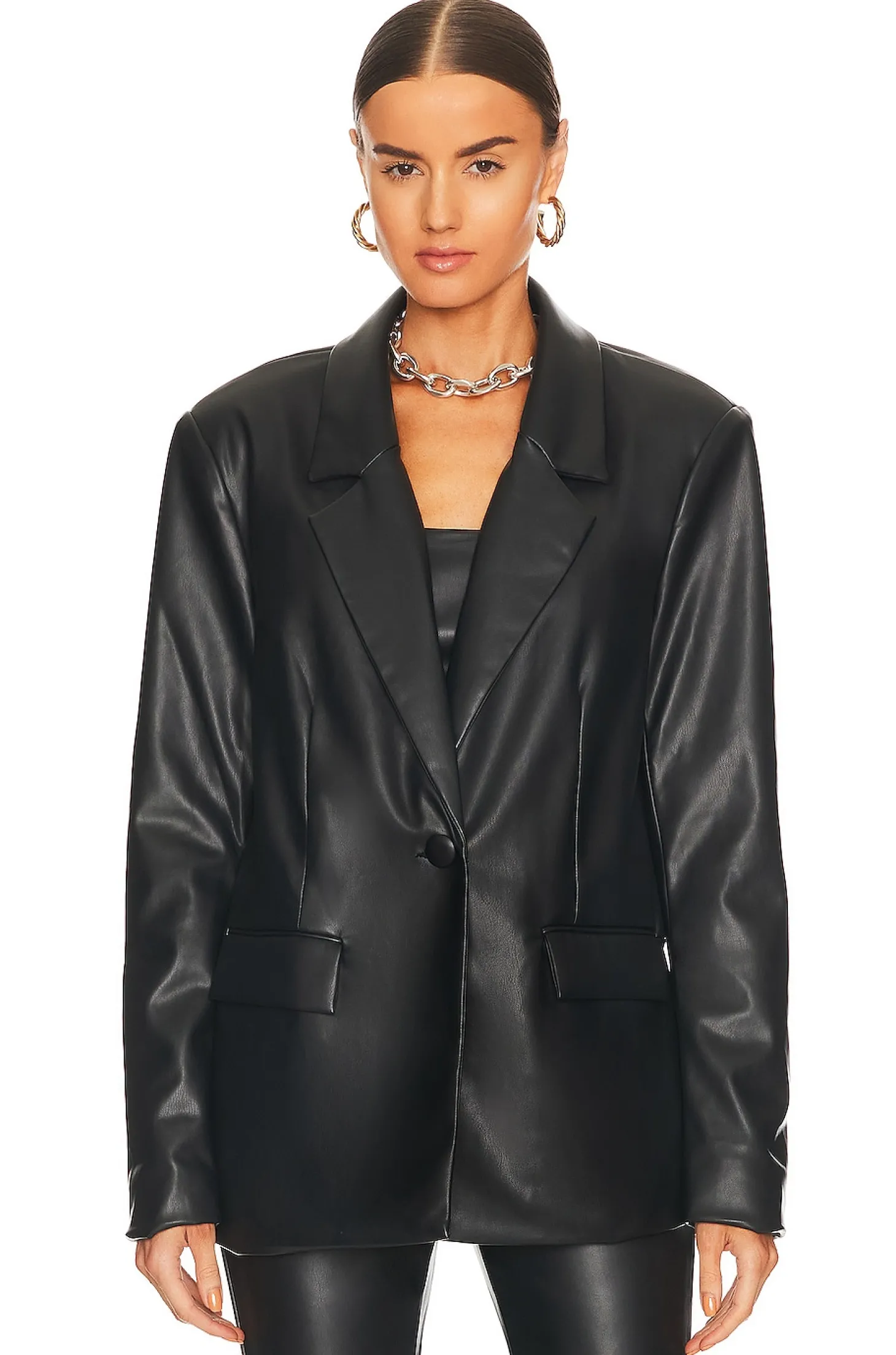 Self: 100% polyurethane Lining: 100% polyester.Made in China.Dry clean only.Front button closure.Front flap pockets.Padded shoulders.Item not sold as a set