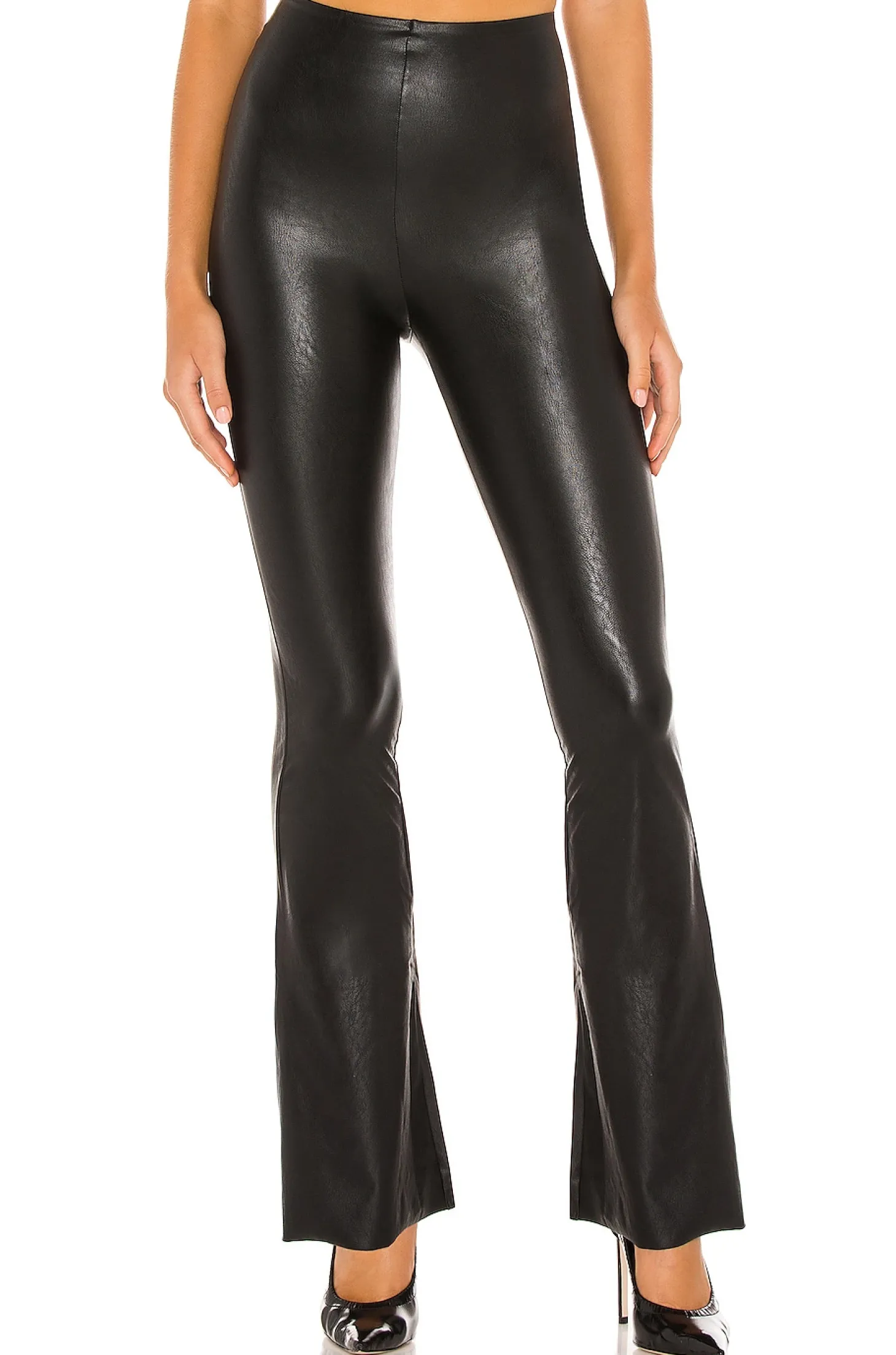 Self: 55% polyurethane 44% viscose 1% elastane Waistband: 72% nylon 28% elastane.Raw cut hem.Faux leather fabric.Smoothing internal waistband.12" at the knee breaks to 19" at the leg opening.Made in USA
