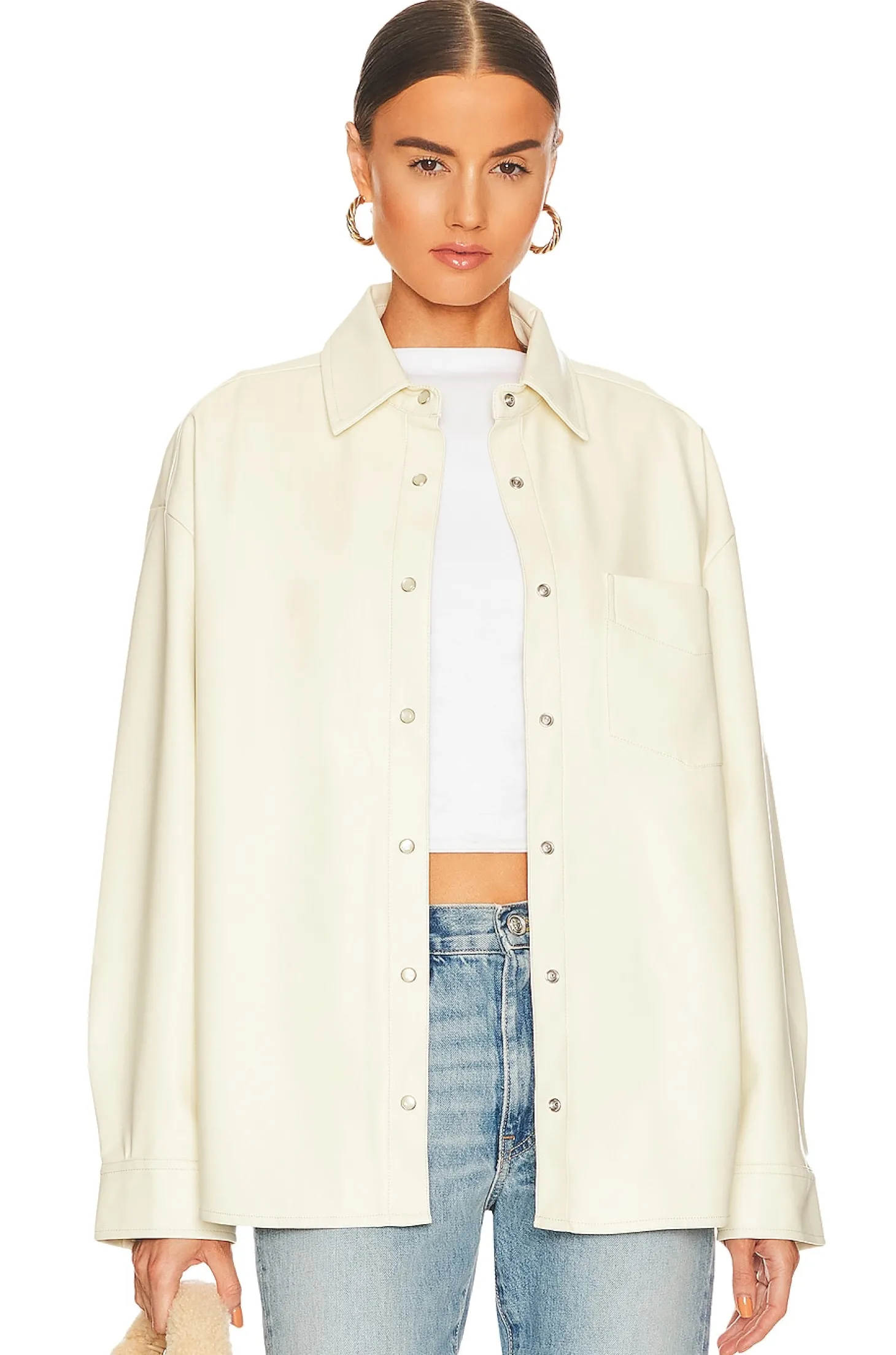 100% polyurethane.Made in China.Dry clean only.Front snap button closure.Breast patch pockets.Buttoned cuffs