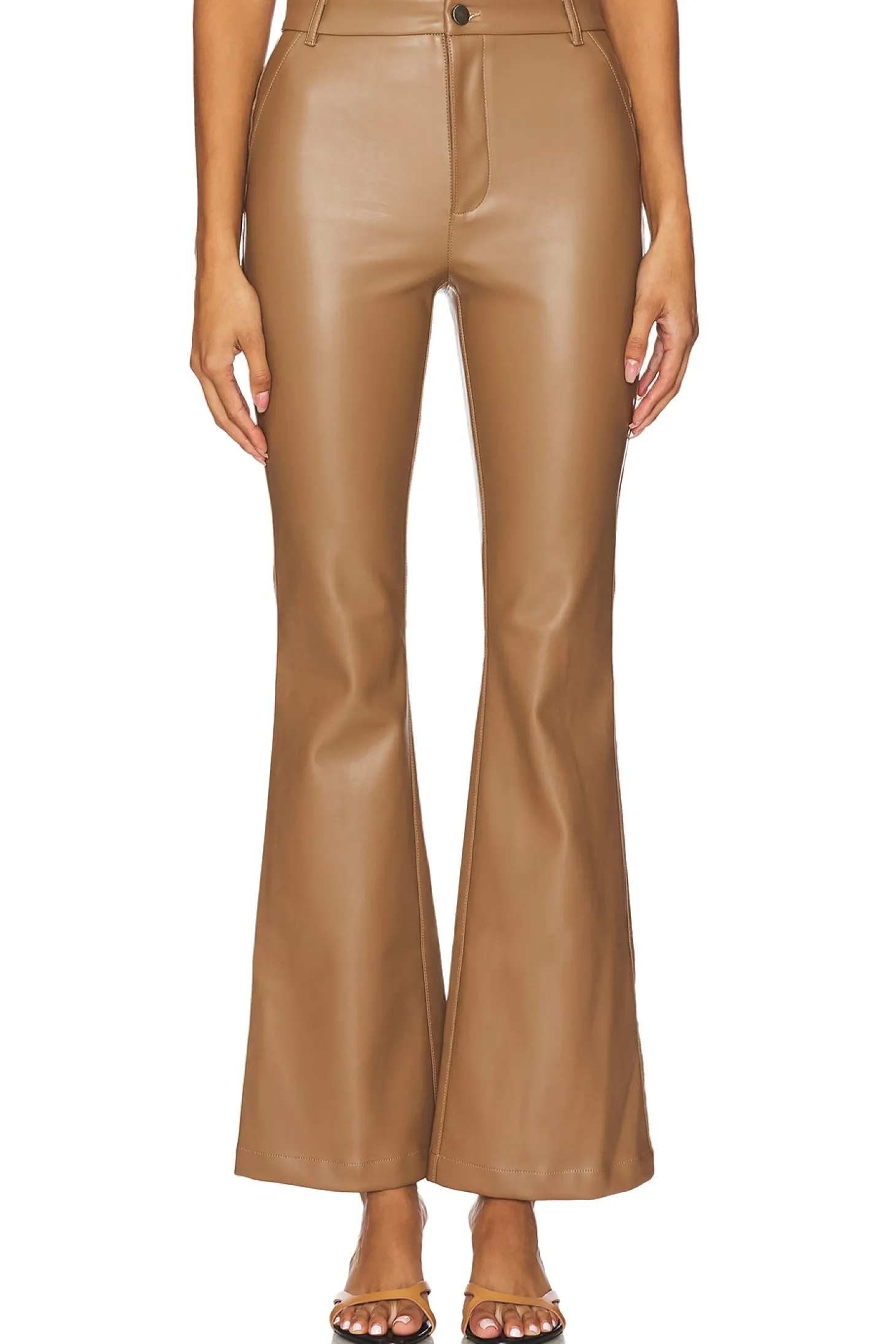 Self: 50% polyester 50% polyurethane Trim: 97% polyester 3% spandex.Made in China.Hand wash.Zip fly and button closure.Faux leather.Item not sold as set.15" at the knee breaks to 19" at the leg opening