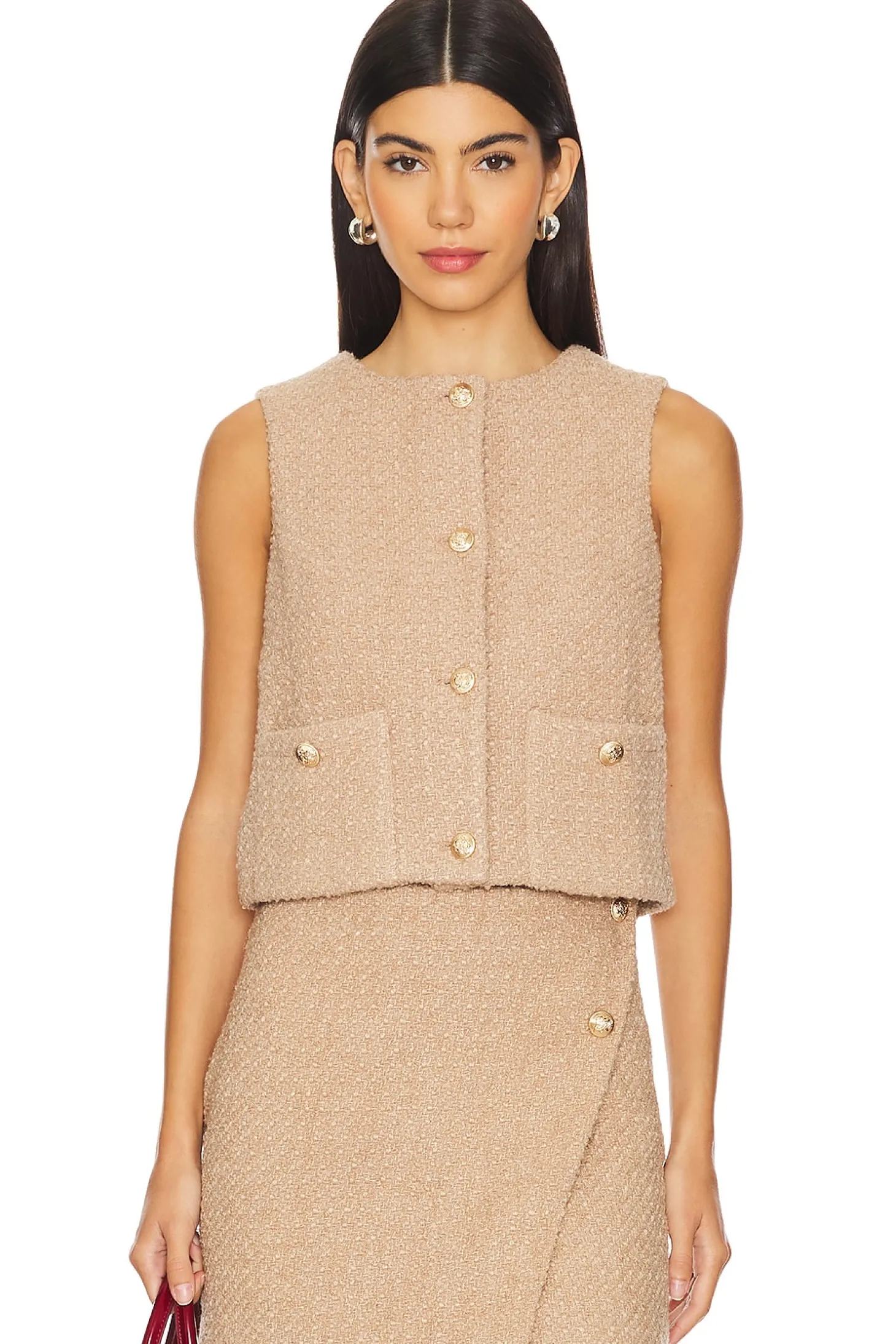 Self: 69% polyamide 25% wool 3% acrylic 2% viscose 1% other fiber Lining: 87% polyester 13% elastane.Made in China.Machine wash.Front button closure.Front pouch pockets.Tweed fabric with gold-tone buttons.Item not sold as a set