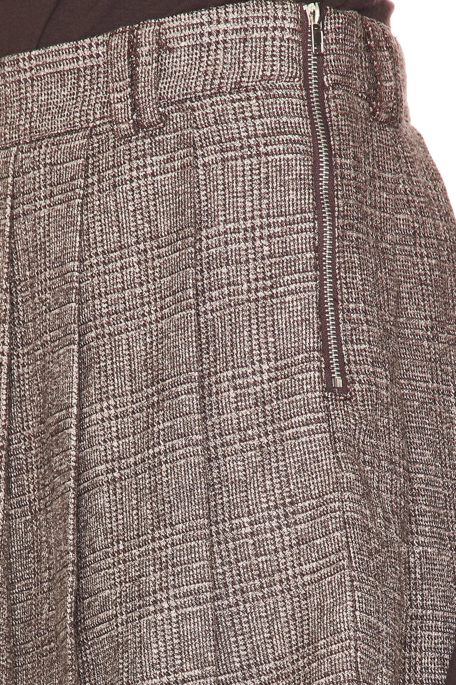 Self: 100% polyester Lining: 95% polyester 5% spandex.Made in China.Dry clean recommended.Shorts lining.Side zipper closure.Side seam pockets Pleated skirt.Tweed fabric with attached belt.Skort measures approx 13.5" in length