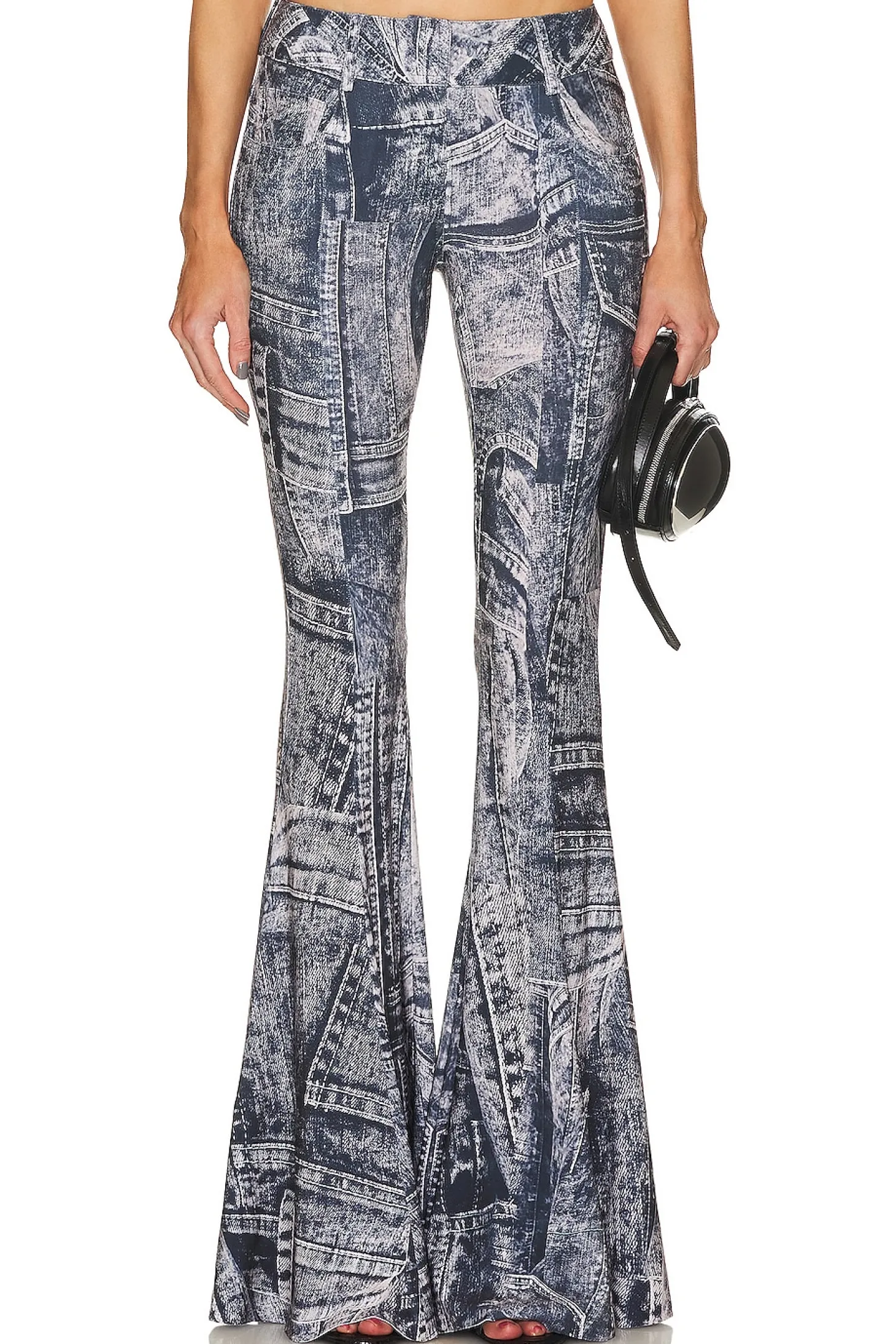 Norma Kamali Fishtail Jean in Black & Navy Denim Print are an ideal choice for seamlessly transitioning from daytime casual to dressed up for a night out. This jean features a flare silhouette fit, designed to enhance your shape with an exaggerated flare at the knee. With versatile appeal, these jeans are the perfect blend of fashion and comfort, ensuring a chic and dynamic look for any occasion..95% polyester 5% spandex.Made in China.Machine wash.Zip fly with velcro closure.5-pocket styling.Jersey fabric.14" at the knee breaks to 22" at the leg opening.style runs large, size down