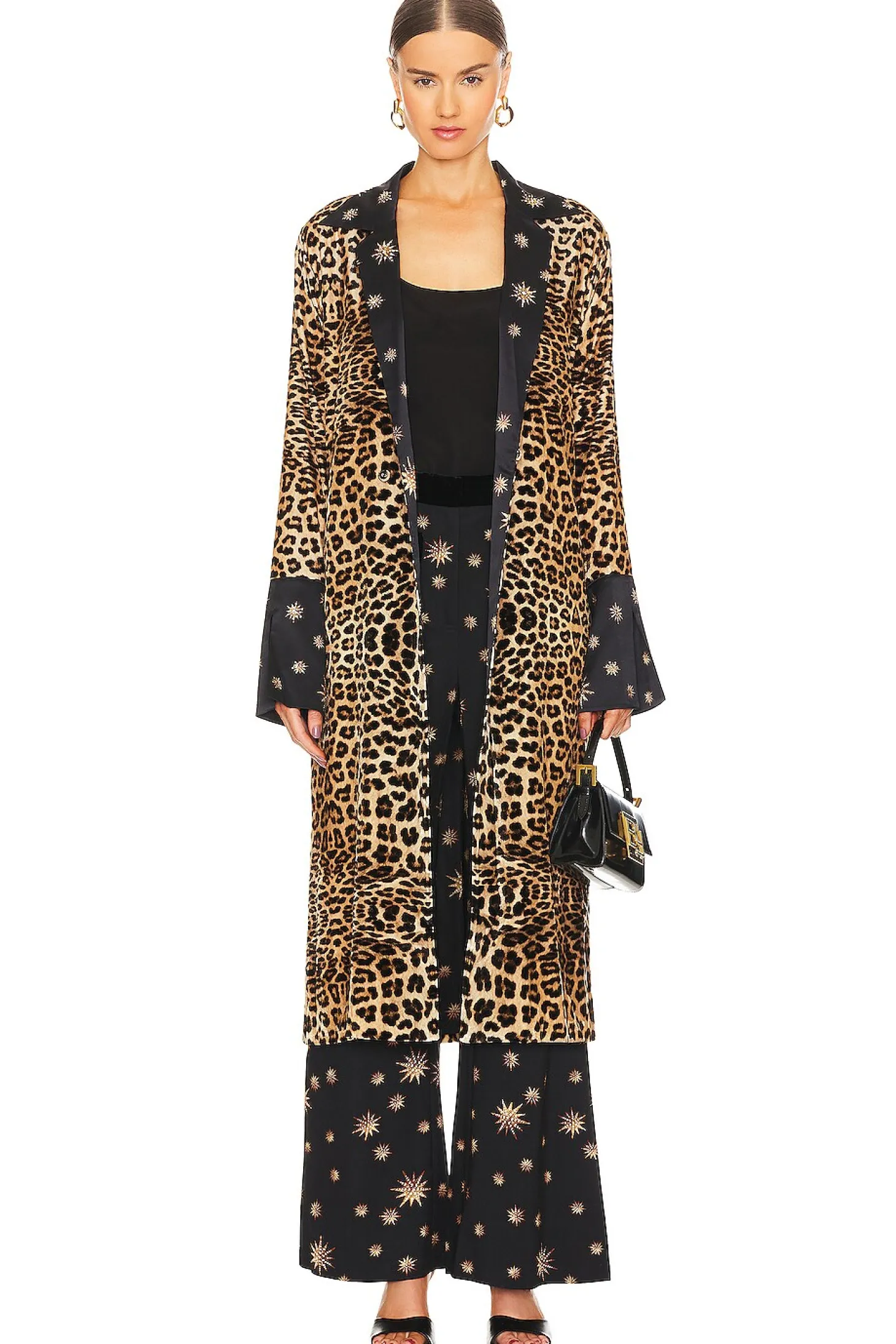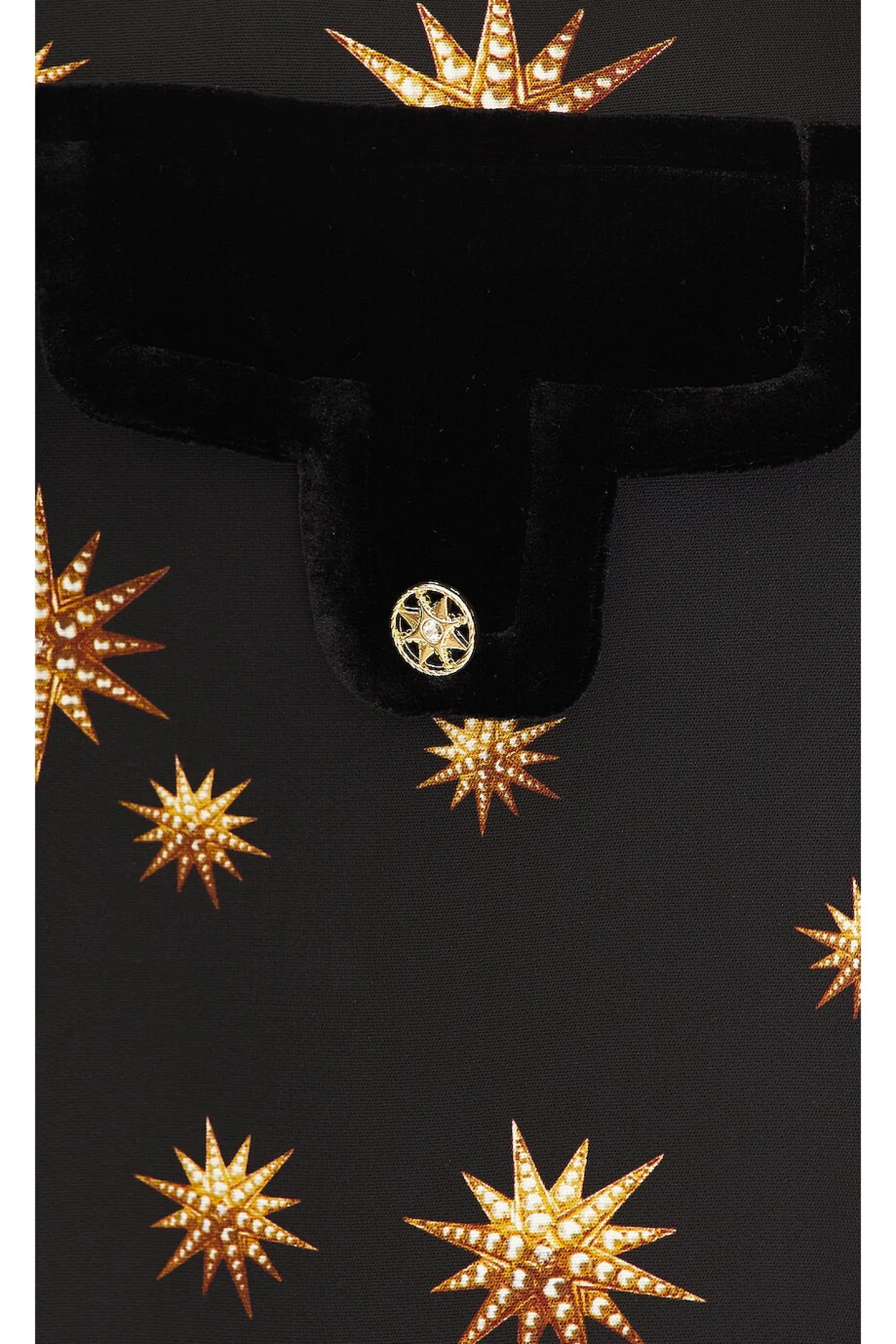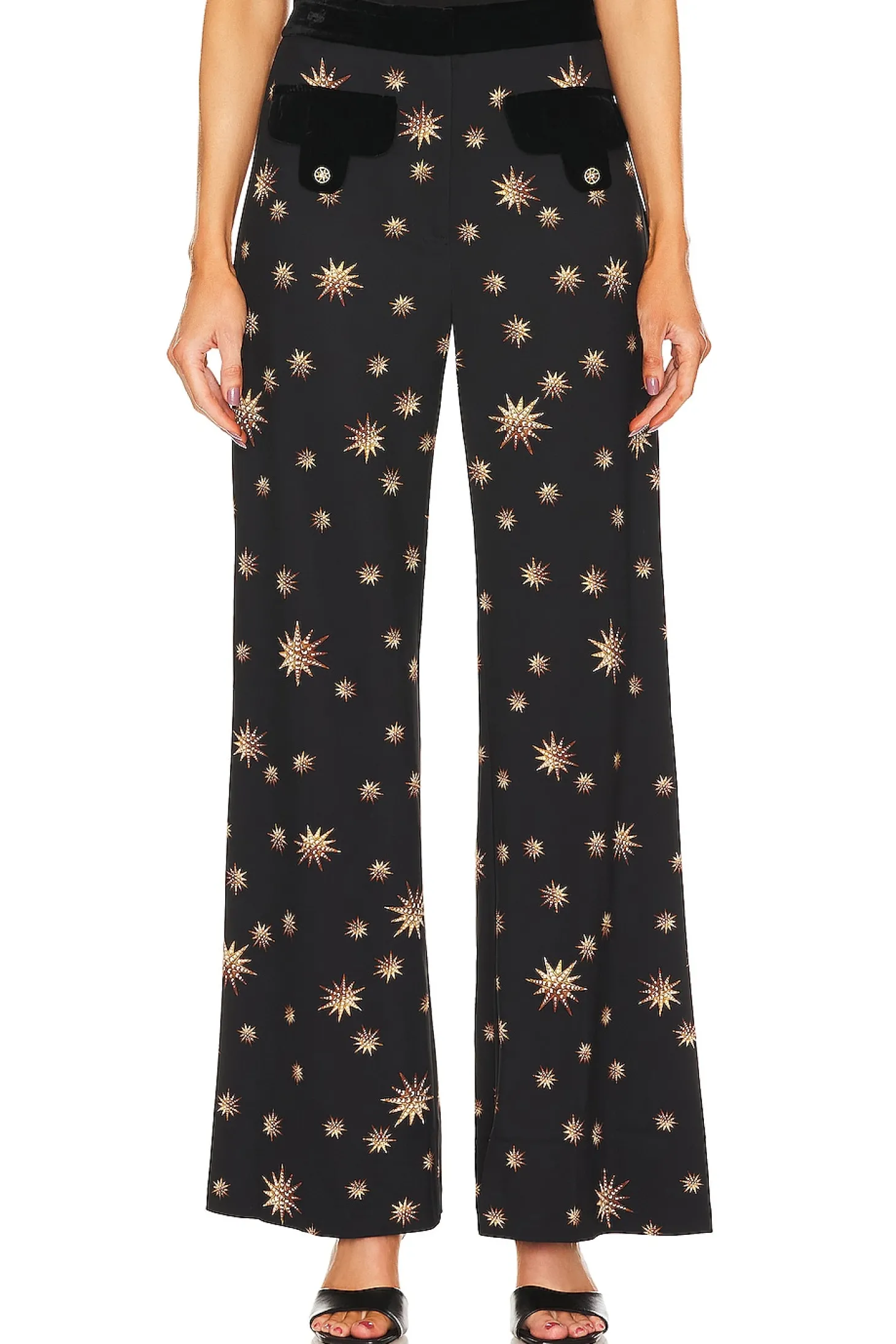 Self: 96% viscose 4% spandex Contrast Fabric 1: 82% viscose 18% silk Contrast Fabric 2: 100% silk.Made in China.Dry clean only.Zip fly with hook and bar closure.Faux flap velvet pockets.19" at the knee breaks to 26" at the leg opening