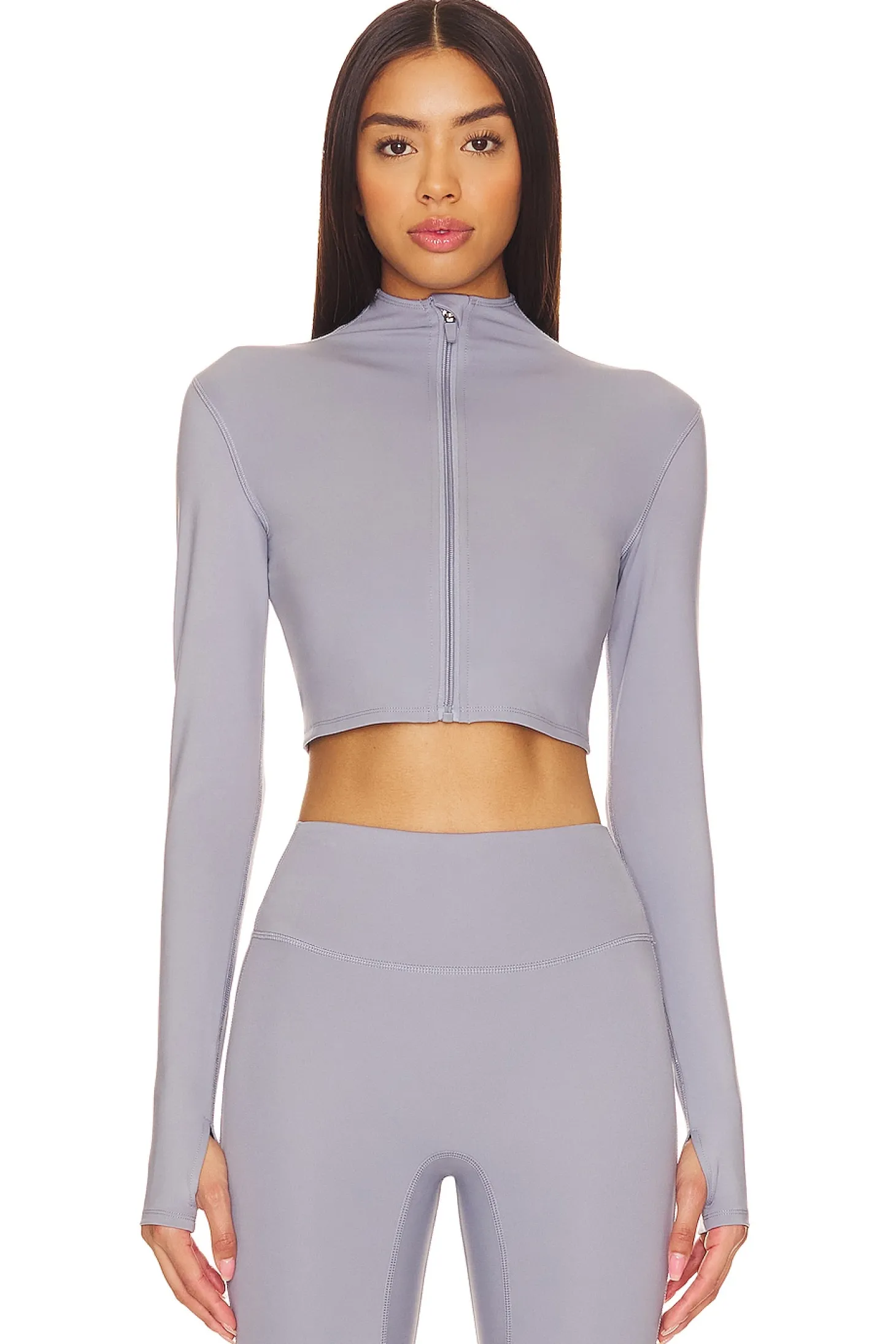 79% recycled polyester 21% elastane.Made in China.Machine wash.Front zipper closure.Thumbhole cut-out.4-way stretch fit with medium support compression.Sweat wicking mid-weight interlock fabric.Item not sold as a set