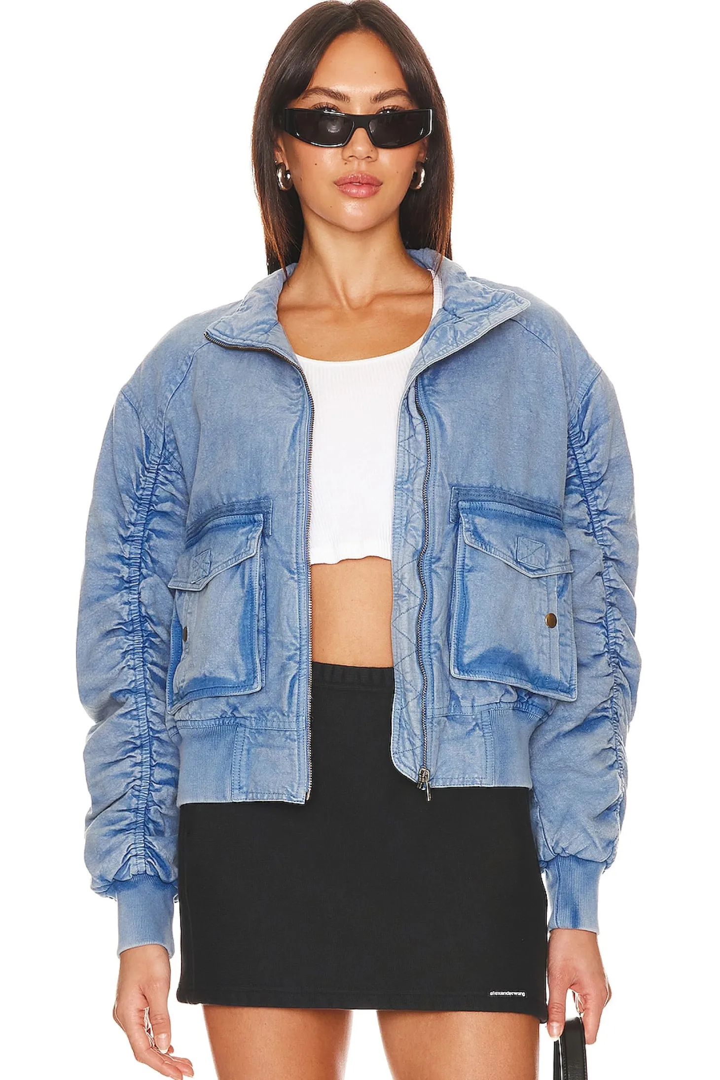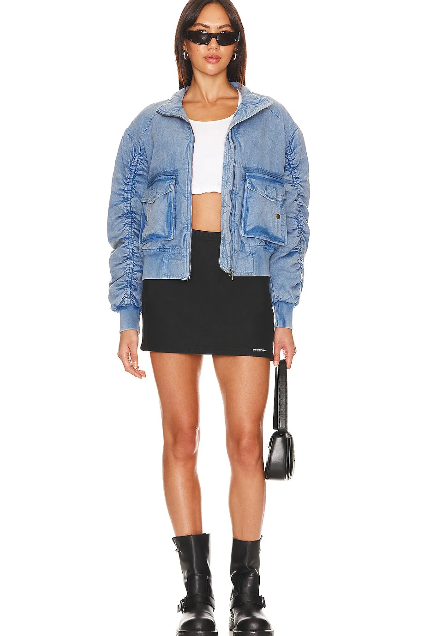 Reimagine denim with the Free People Flying High Bomber in Denim Grey. Embrace the cold weather in style with this puffer-style denim jacket featuring elastic ruched sleeves. Perfect for wearing anywhere, it's a versatile piece that plays on denim for a contemporary, on-the-go look..Cotton blend fabric.Made in India.Machine wash recommended.Front zipper closure.4-pocket styling.Puffer style denim fabric with elastic ruched sleeves