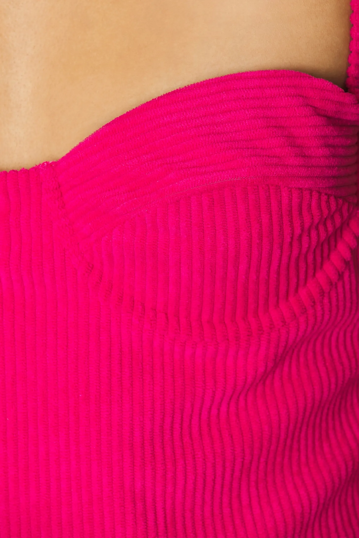 Corduroy textile.Imported.Machine wash recommended.Unlined.Hidden back zipper closure.Contour bust.Lightweight ribbed fabric