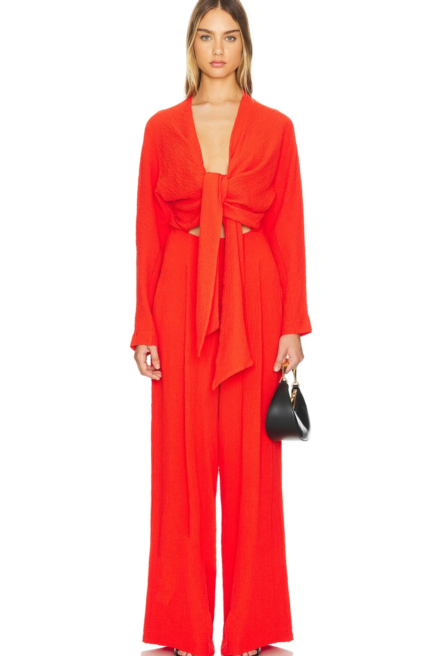 Self: 51% recycled polyester 48% viscose 1% elastane Lining: 100% viscose.Made in China.Machine wash.Open style with wrap tie closure.Side seam pockets.Gauze fabric