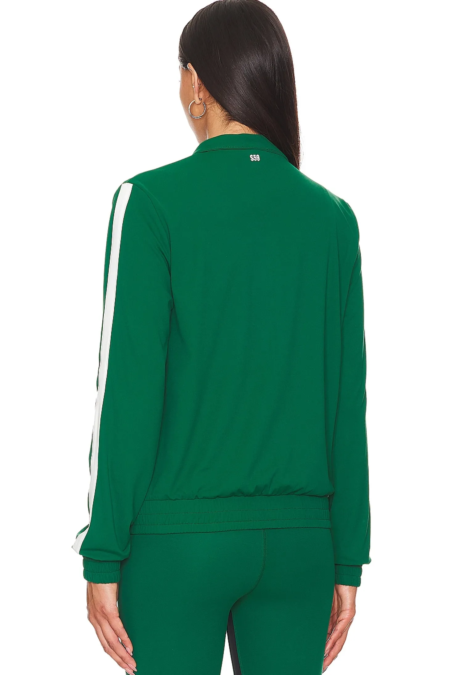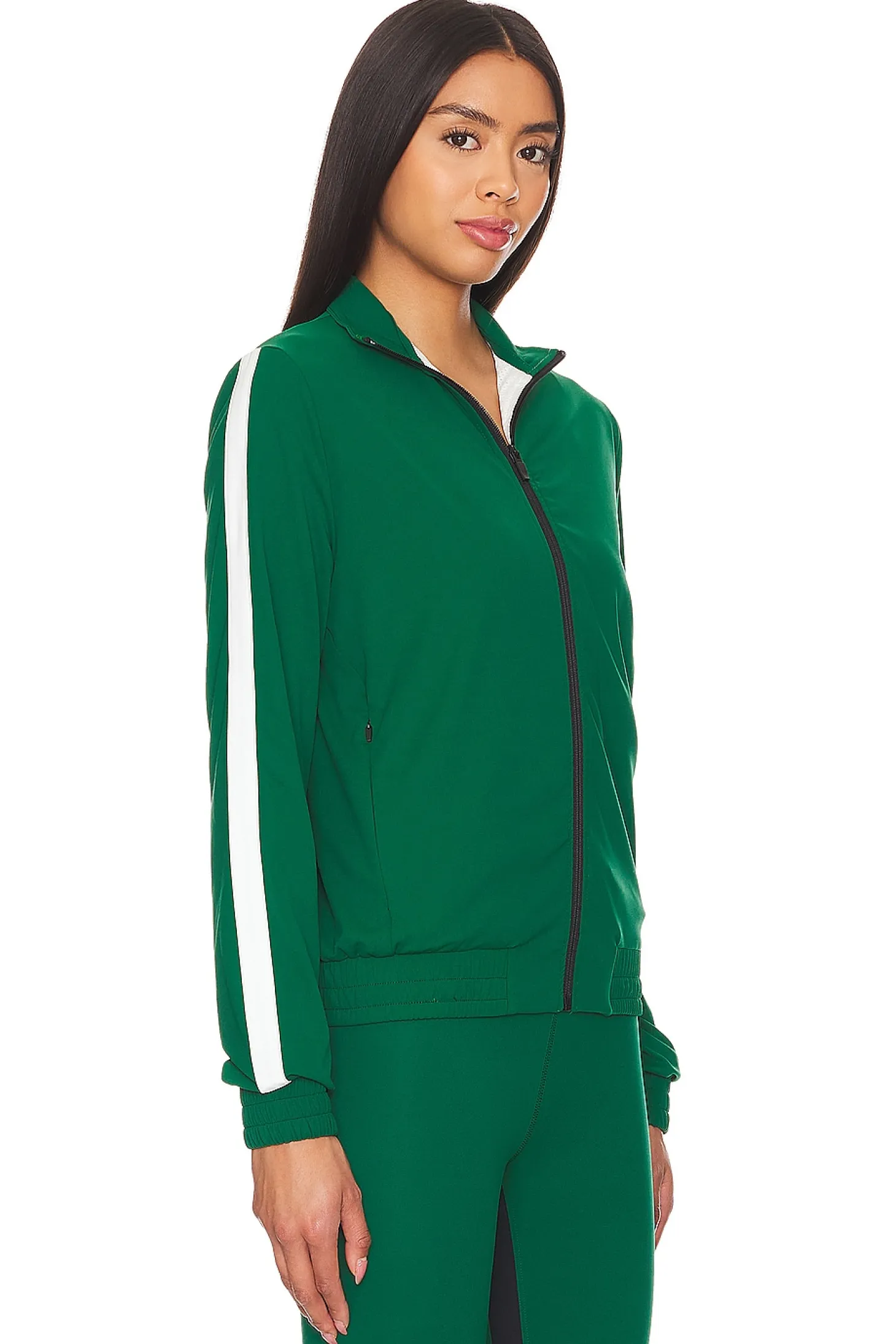 Self: 62% nylon 38% elastane Contrast Fabric: 95% polyester 5% spandex.Made in China.Machine wash.Front zipper closure.Side slant pockets.Midweight jersey fabric.Item not sold as a set