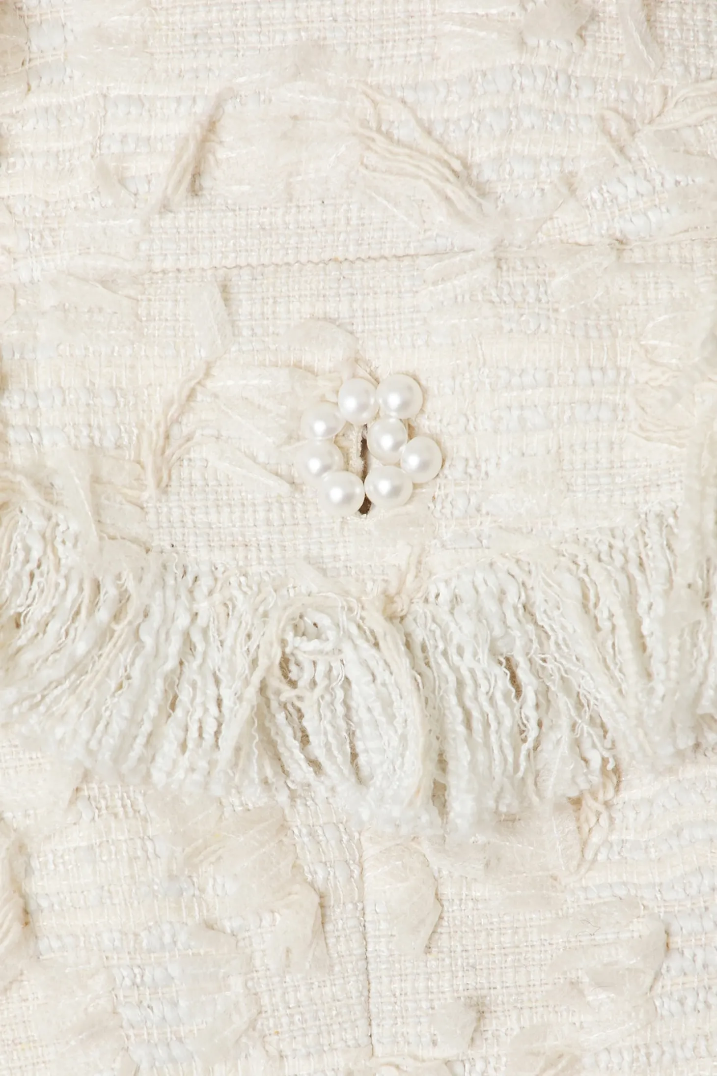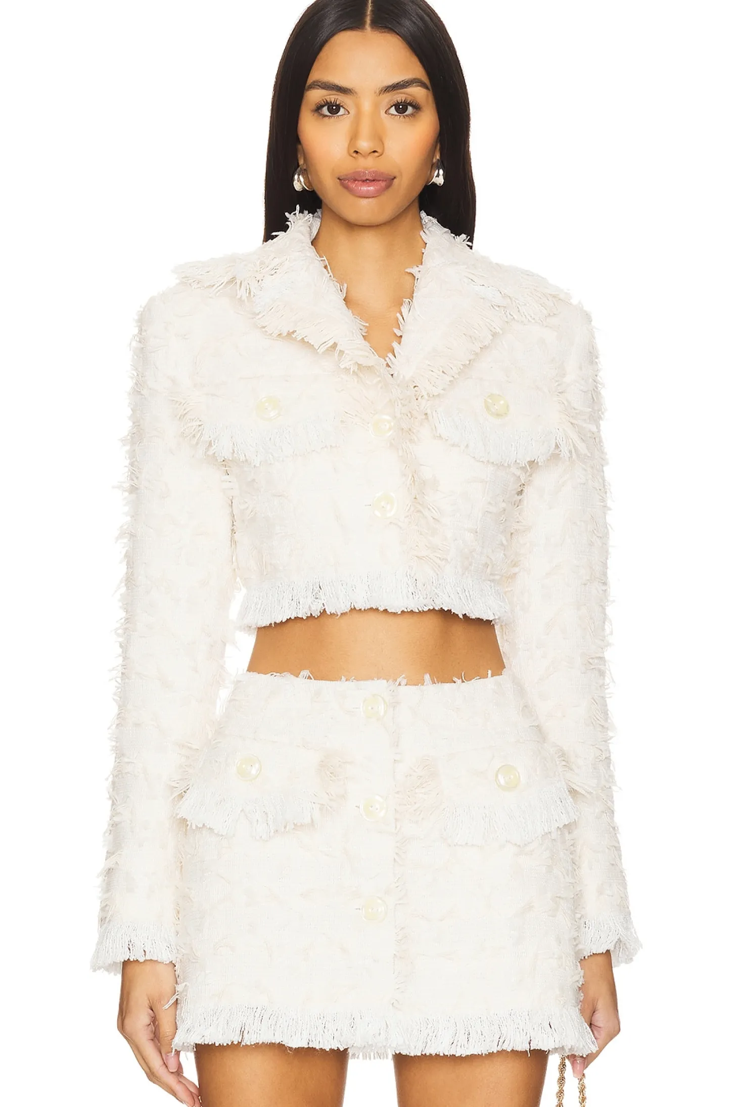 Tweed textile.Made in China.Dry clean recommended.Front button closure.Breast flap pockets.Buttoned cuffs.Tweed fabric with fringe trim throughout