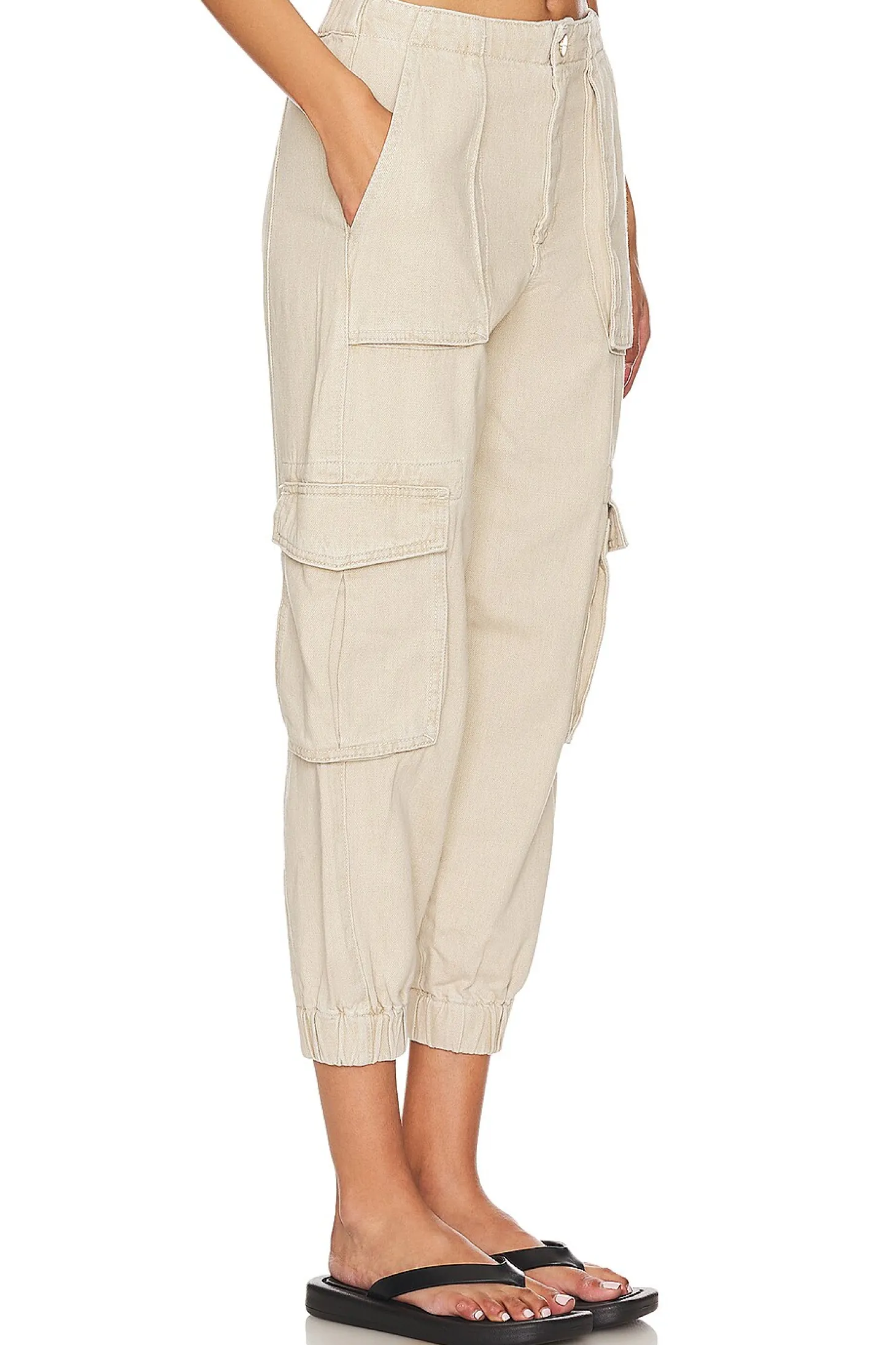76% cotton 24% lyocell.Made in Turkey.Machine wash.Zip fly with button closure.Elastic waistband.4-pocket styling includes two cargo flap pockets.Rigid denim.18" at the knee narrows to 10" at the leg opening Size 4 waist circumference measures approx 26"