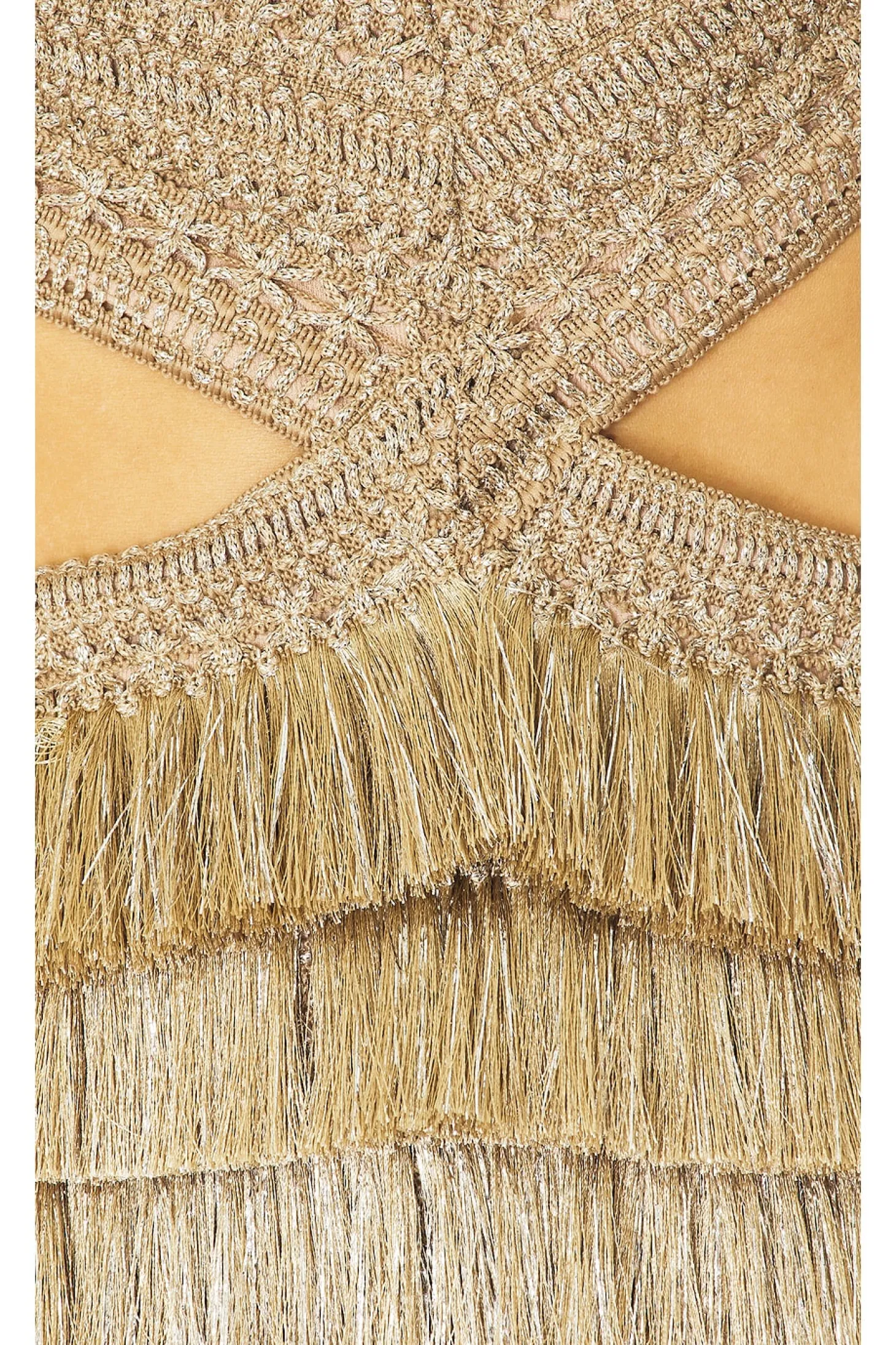 Self: 88% polyester 12% elastane Fringes: 95% polyester 5% elastodiene Lining: 100% polyamide.Made in Brazil.Hand wash.Fully lined.Hidden skirt zipper closure Exposed back zipper closure