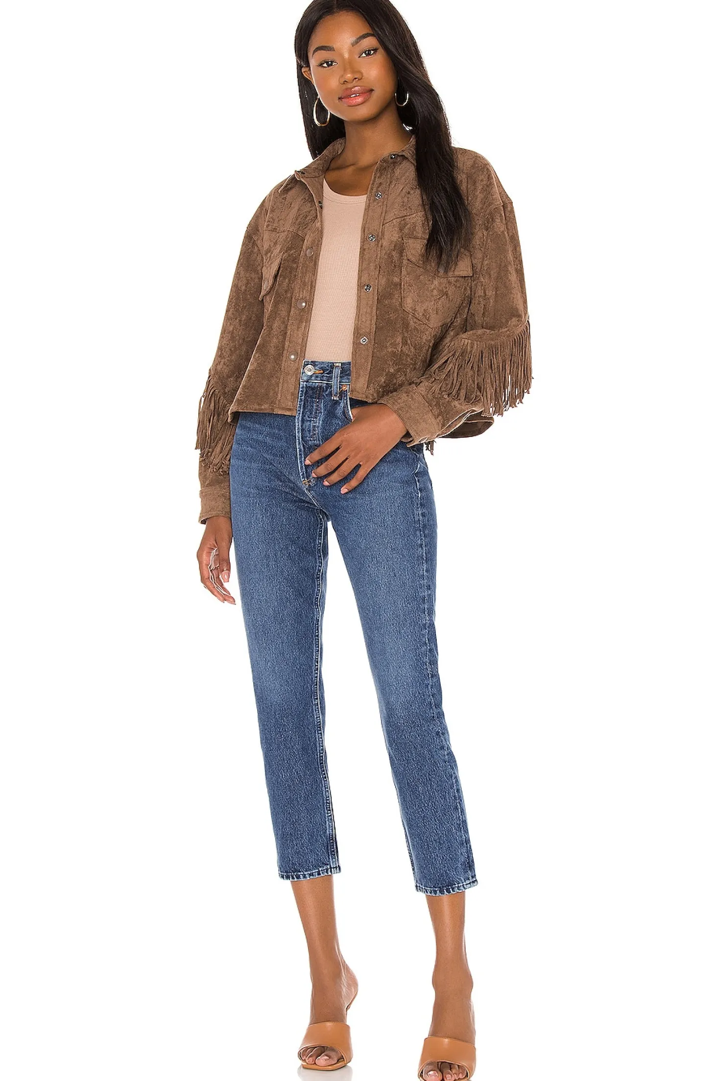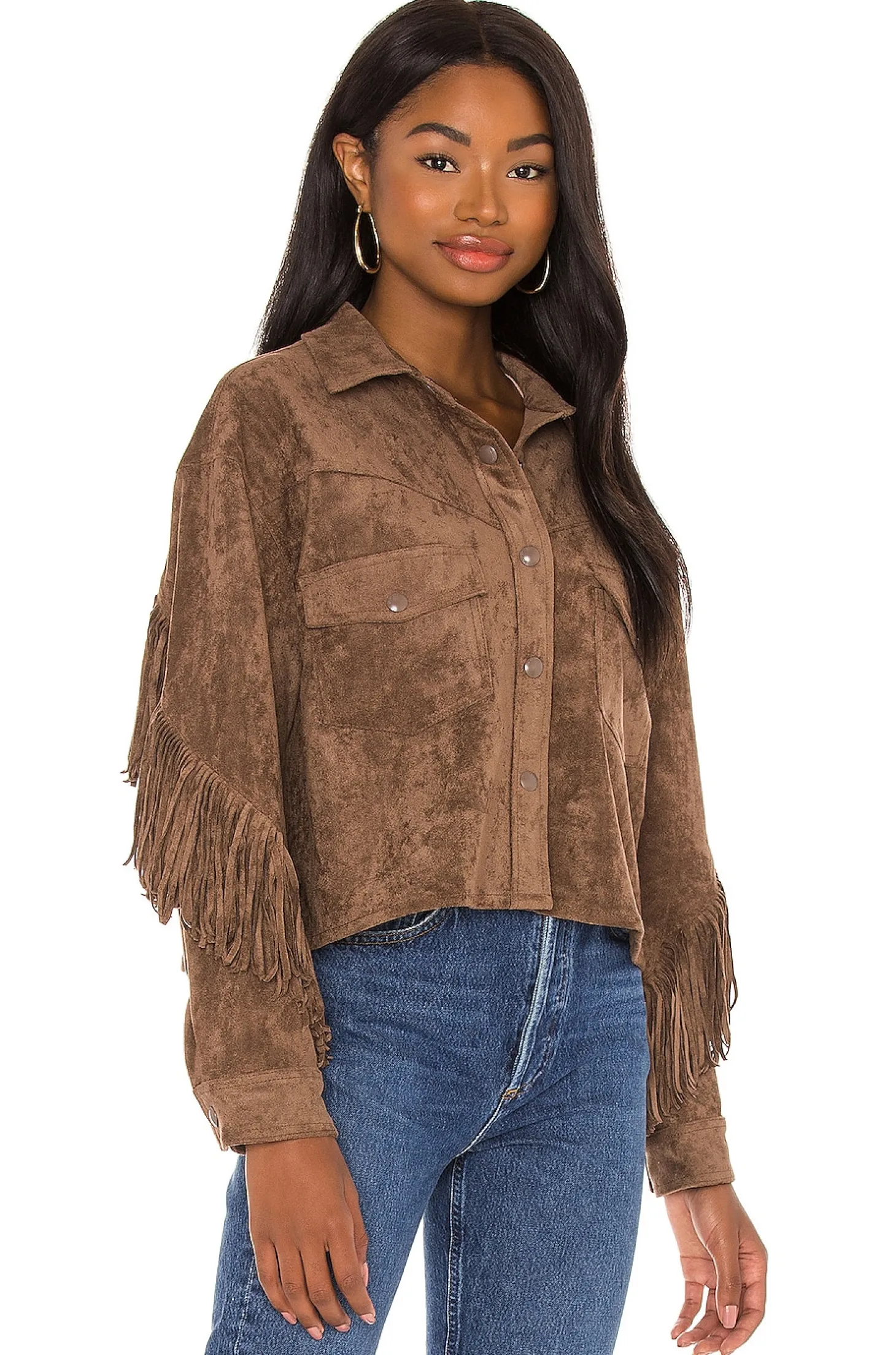 90% poly 10% spandex.Dry clean recommended.Front snap button closure.Buttoned cuffs.Button-flap breast pocket.Faux suede with fringe trim.Imported
