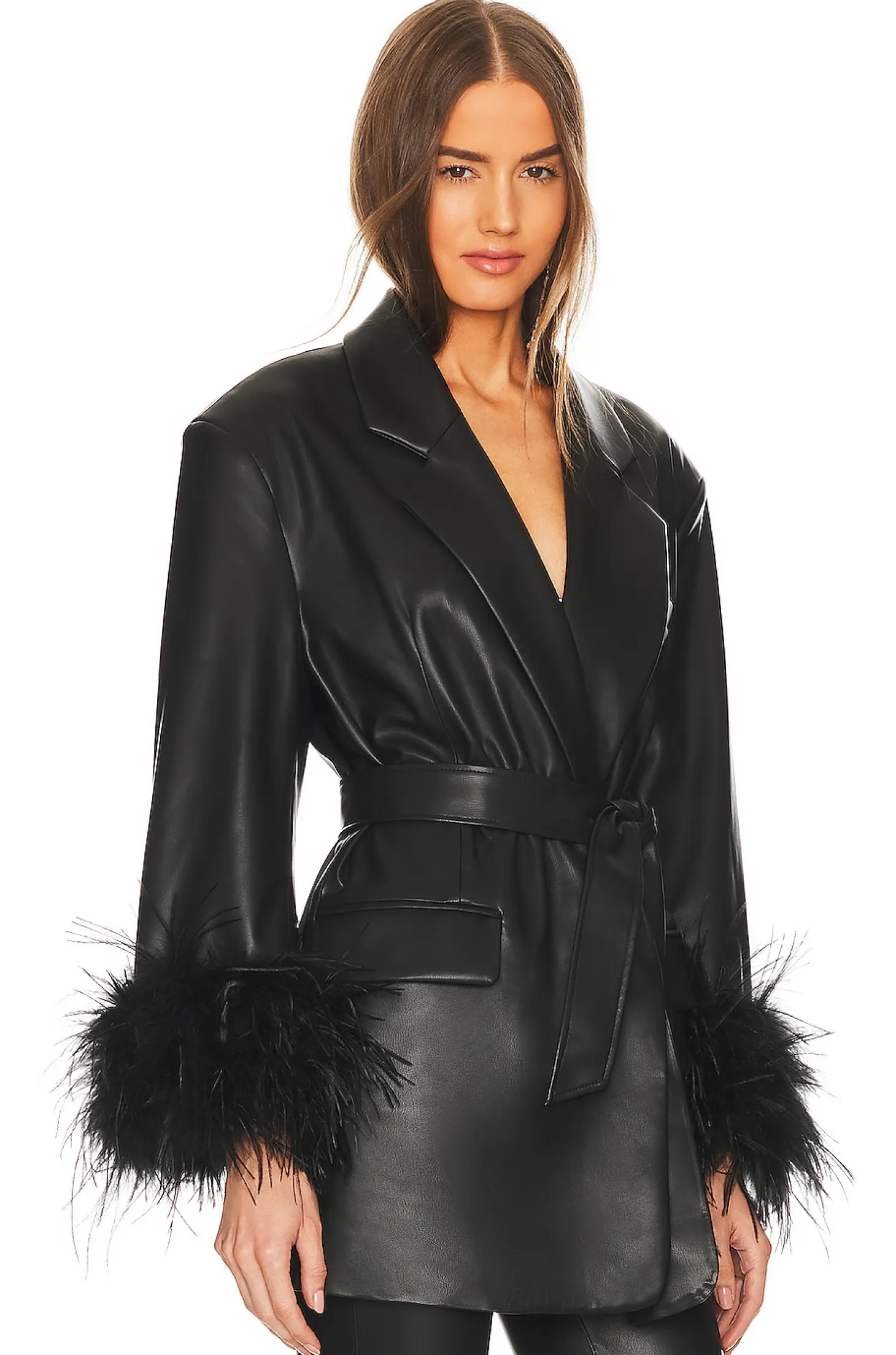Self & Lining: 100% polyester Coating: 100% polyurethane.Made in China.Dry clean.Detachable waist tie closure.Padded shoulders.Front flap pockets.Faux feather cuffs.Smooth faux leather fabric