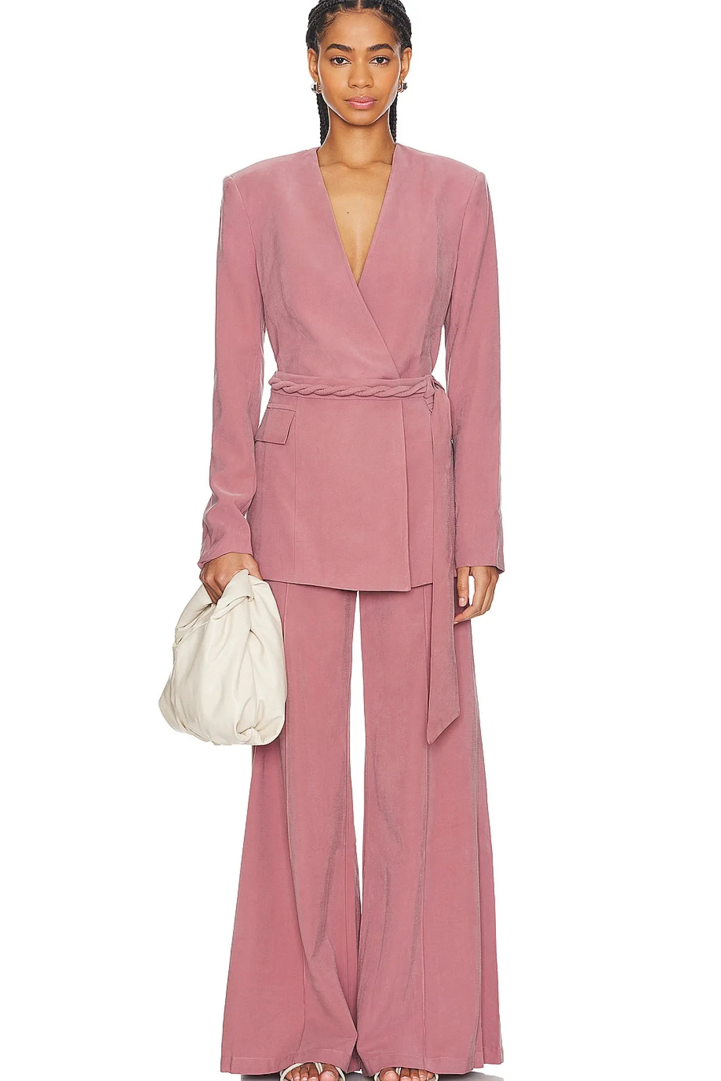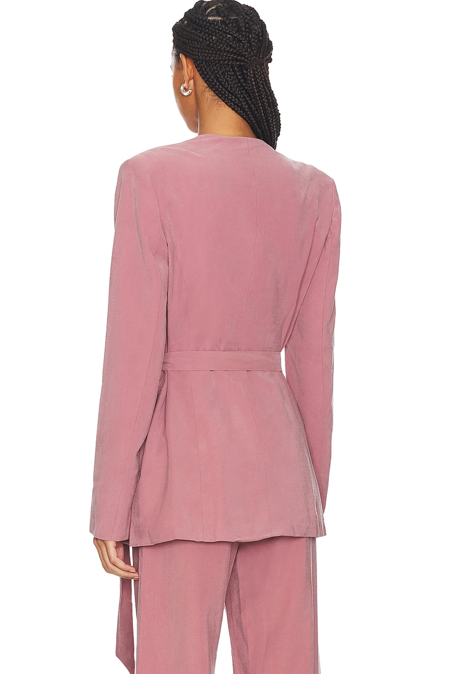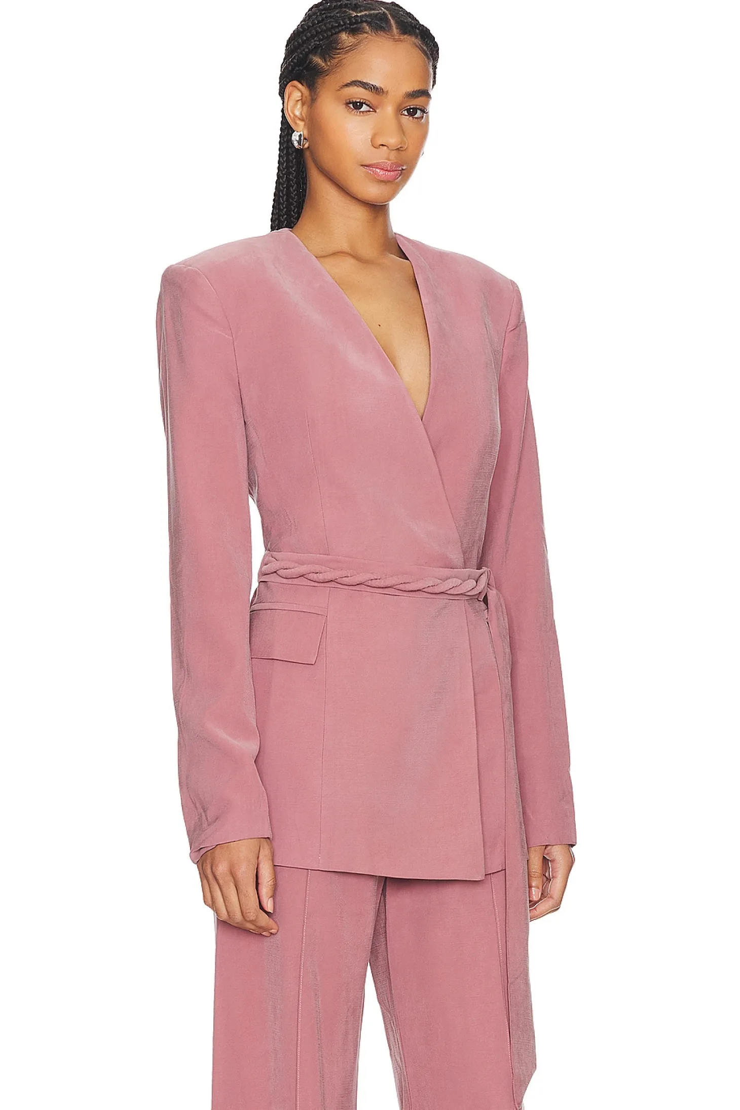 Self: 92% viscose 8% polyester Lining: 100% polyester.Made in Israel.Hand wash.Double-breasted with button closure and optional waist tie.Padded shoulders.Side flap pockets.Item not sold as a set