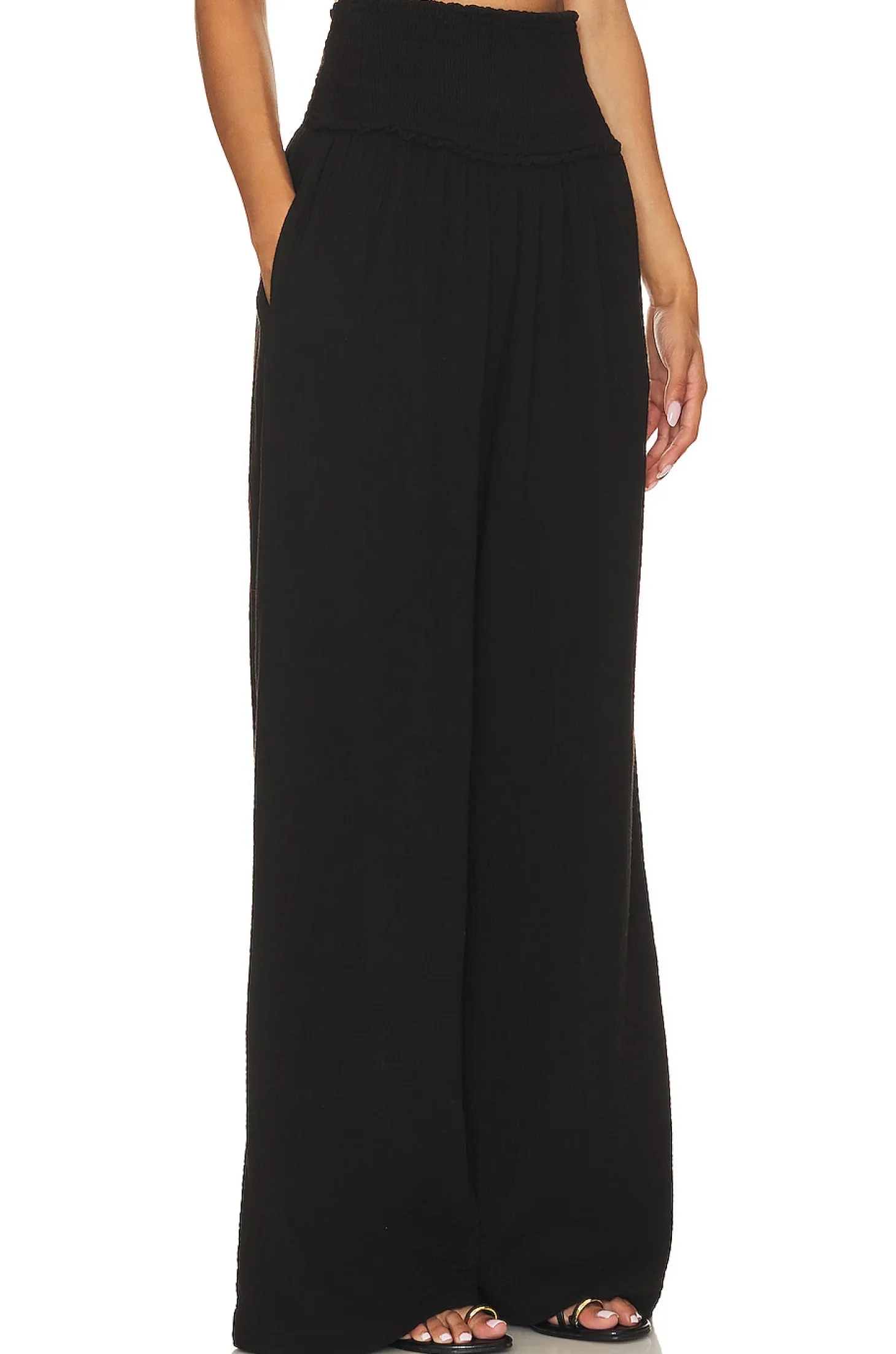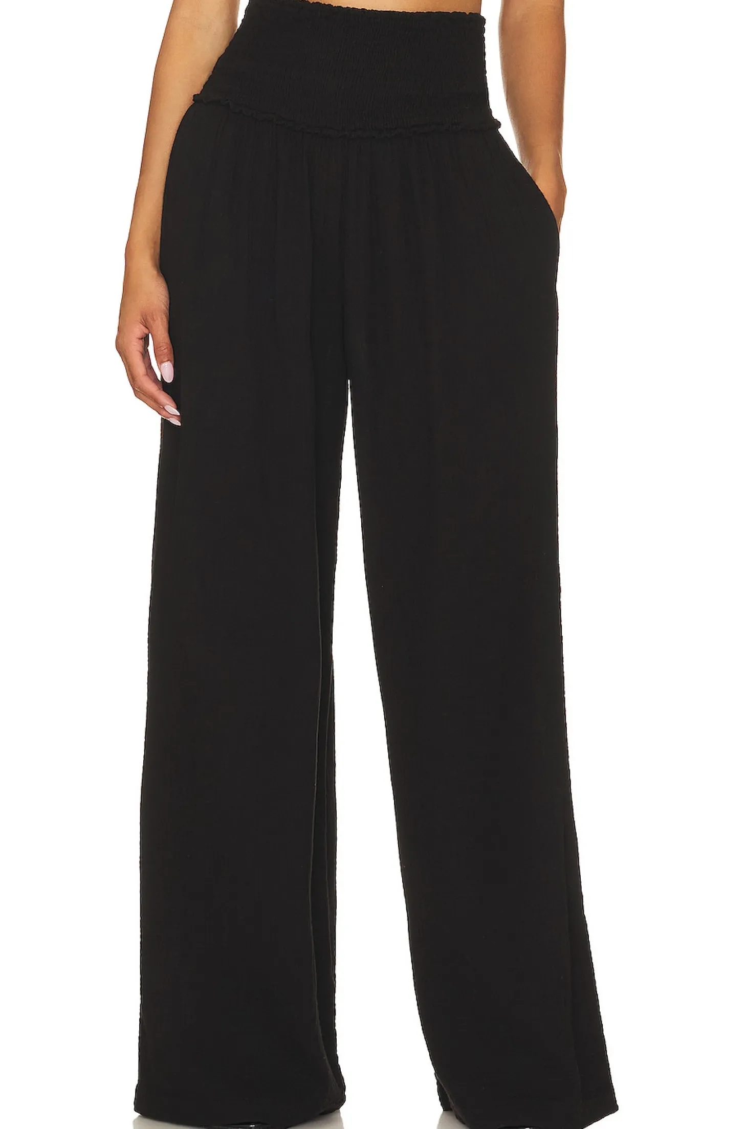 100% cotton.Made in USA.Machine wash.Pull-on styling with smocked waistband.Side slant pockets.Lightweight gauze fabric.Item not sold as a set.23" at the knee breaks to 27" at the leg opening