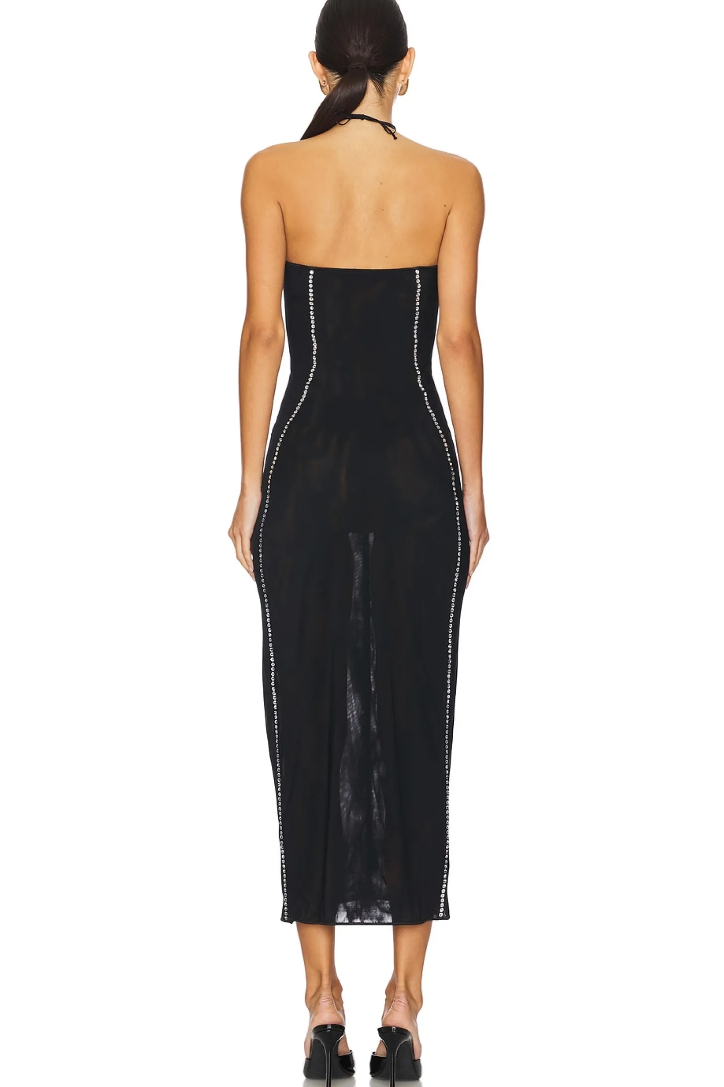 82% polyamide 18% elastane.Made in Italy.Dry clean only.Unlined.Adjustable halterneck tie closure Underwire cups.Rhinestone detailing Lightweight mesh fabric.Garment is made with a semi-sheer fabric, undergarments can show through