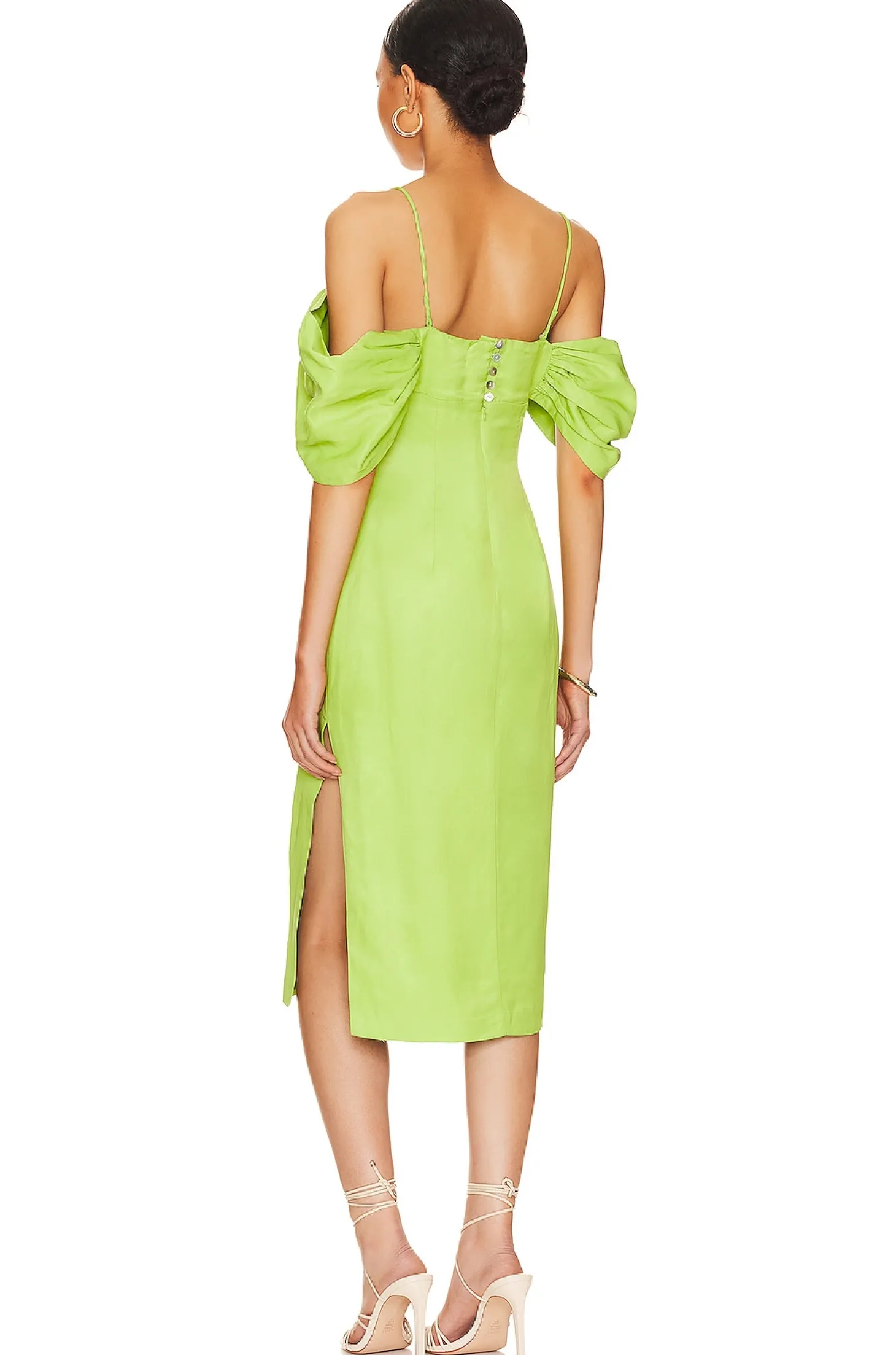 Self: 70% linen 30% cotton Lining: 100% cotton.Made in China.Hand wash.Fully lined.Hidden back zipper with pearlescent loop button closure.Adjustable button shoulder straps with draped sleeves.Ruched bust detail Lightweight linen fabric with side seam slit