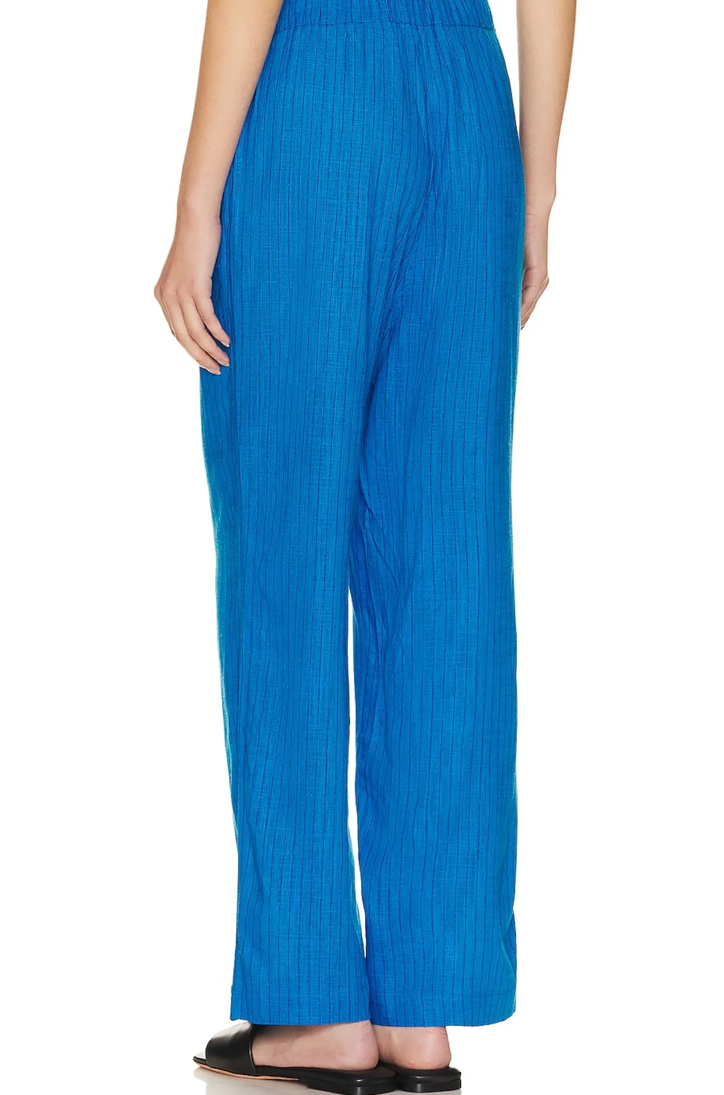 70% rayon 30% linen.Made in China.Machine wash.Elastic waistband with drawstring tie closure.Side slant pockets.Item not sold as set.17" at the knee and 17" at the leg opening
