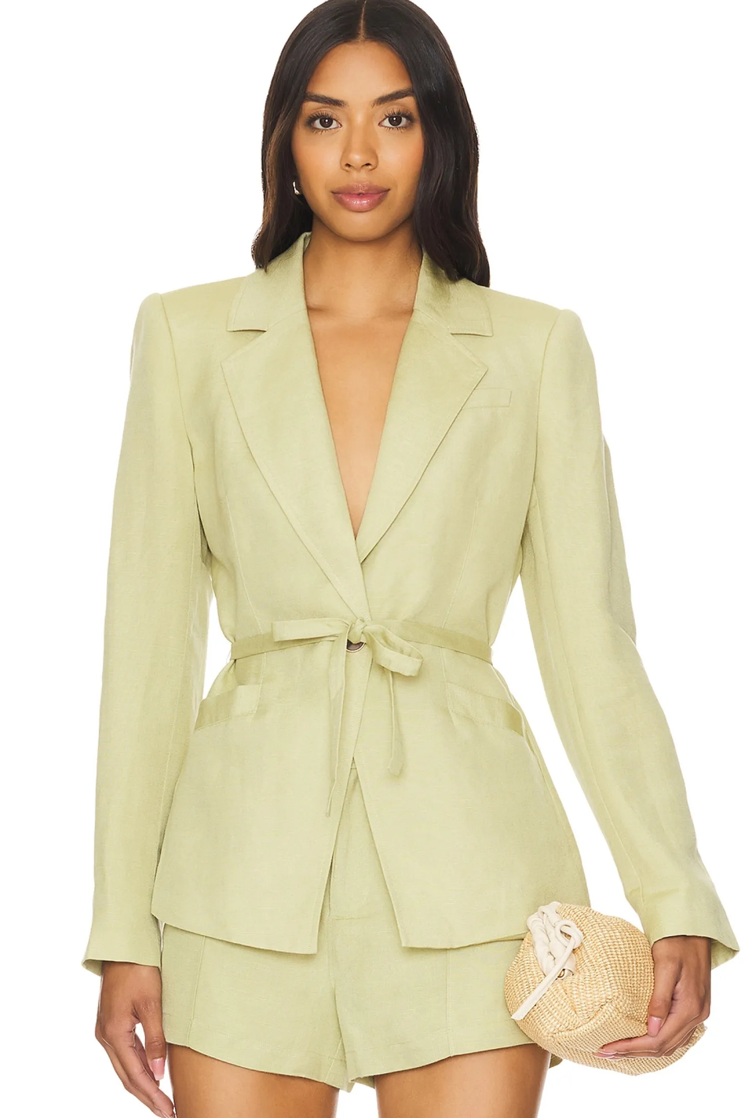 Self: 58% linen 42% rayon Lining: 100% rayon.Made in China.Hand wash.Singular front button closure.Attached waist tie.Button cuffs.Padded shoulders.Lightweight twill fabric Item not sold as a set