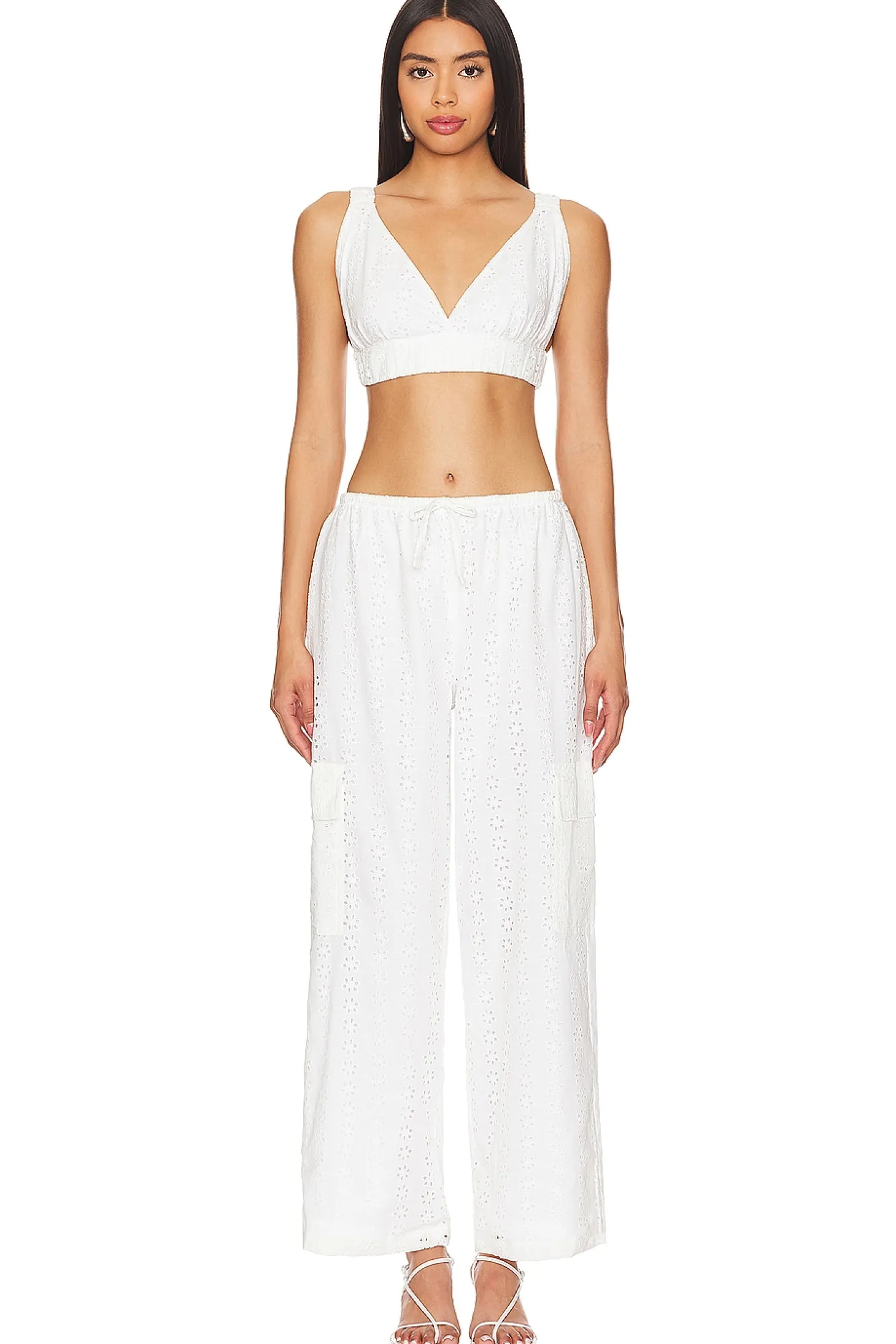 100% cotton.Made in Peru.Hand wash.Elastic underband and shoulder straps.Lightweight eyelet fabric.Item not sold as a set