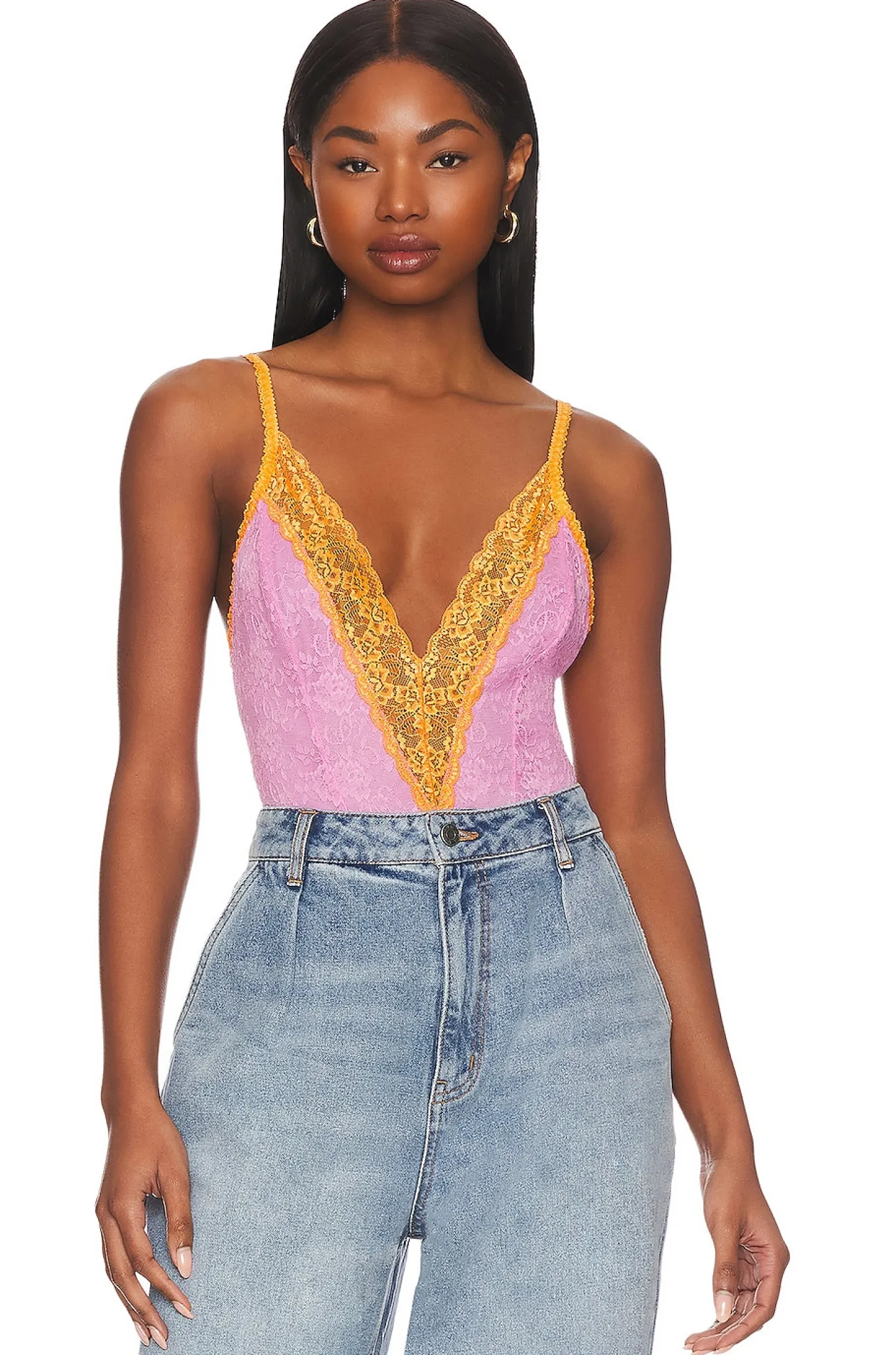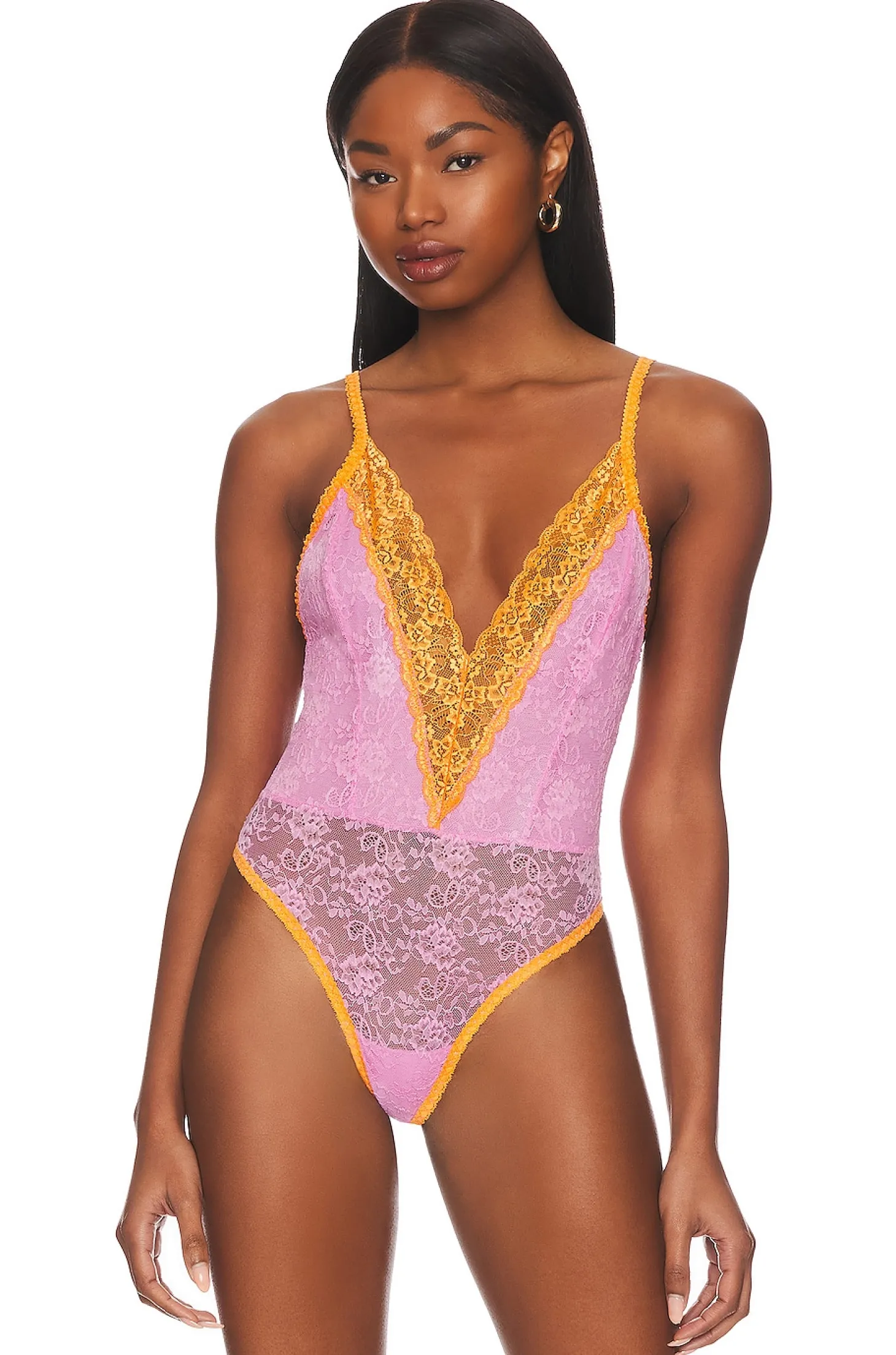 Self: 90% nylon 10% spandex Lining 1: 89% nylon 11% elastane Lining 2: 100% cotton.Made in China.Hand wash.Adjustable shoulder straps.Plunging neckline.Thong back.Lace fabric