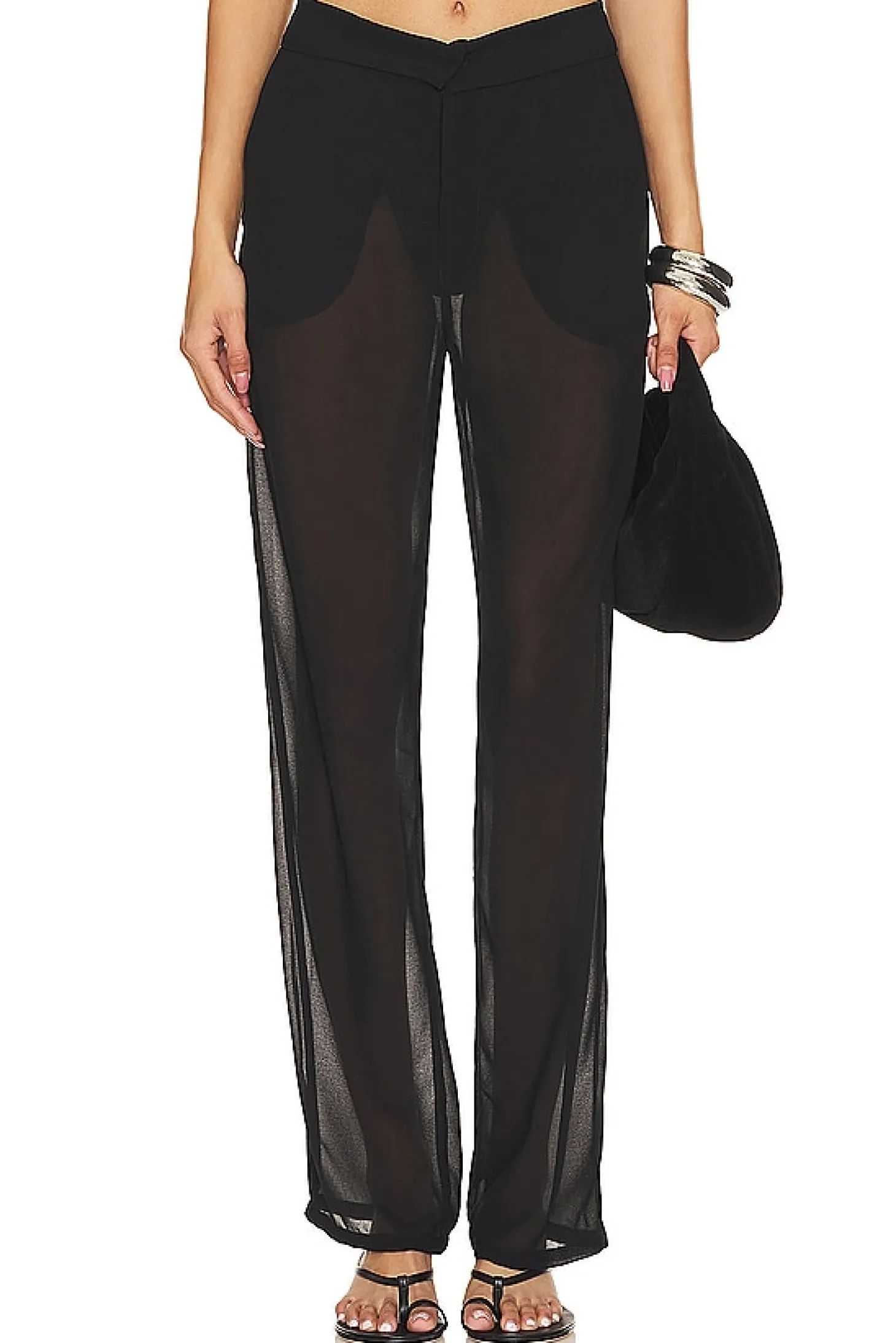 100% polyester.Made in Thailand.Hand wash.Zip fly with button closure.Side slip pockets.Sheer chiffon fabric.Garment is intentionally sheer, undergarments will show through. Please note undergarment not included.18.5" at the knee and 18.5" at the leg opening Size XS measures approx 27" in circumference