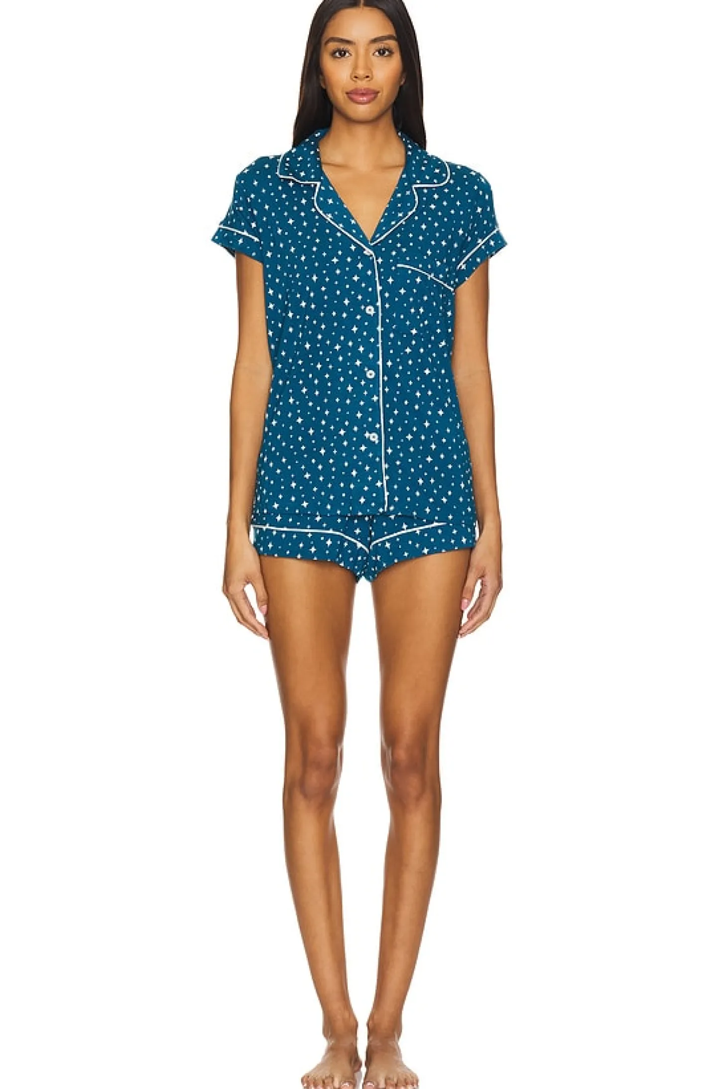 95% tencel ™ modal 5% elastane.Made in China.Machine wash.Front button closure.Breast slip pocket.Lightweight jersey fabric.Sold as a set