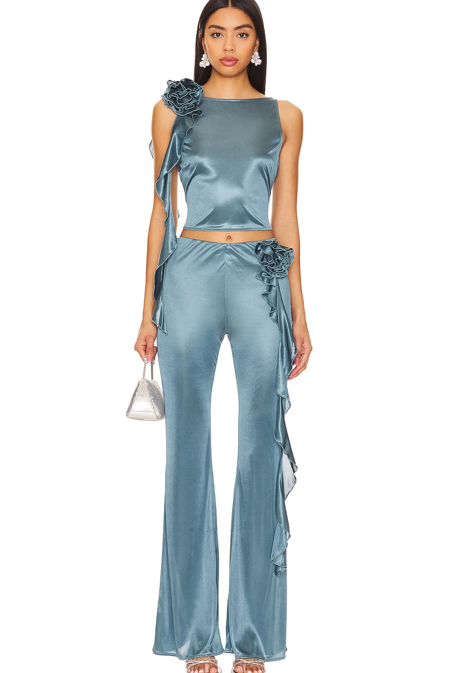 Need new going out flair? Choose the Lovers and Friends Giulia Pant in Teal Grey for a guaranteed good time. The satin fabric and florette detail with draped ruffle side make these pants a standout choice. Embrace the flair- own the night with this fashion-forward piece!.100% polyester.Made in China.Hand wash.Hidden side zipper closure.Florette at side with draped ruffle side.Satin fabric Item not sold as set.17" at the knee breaks to 26" at the leg opening