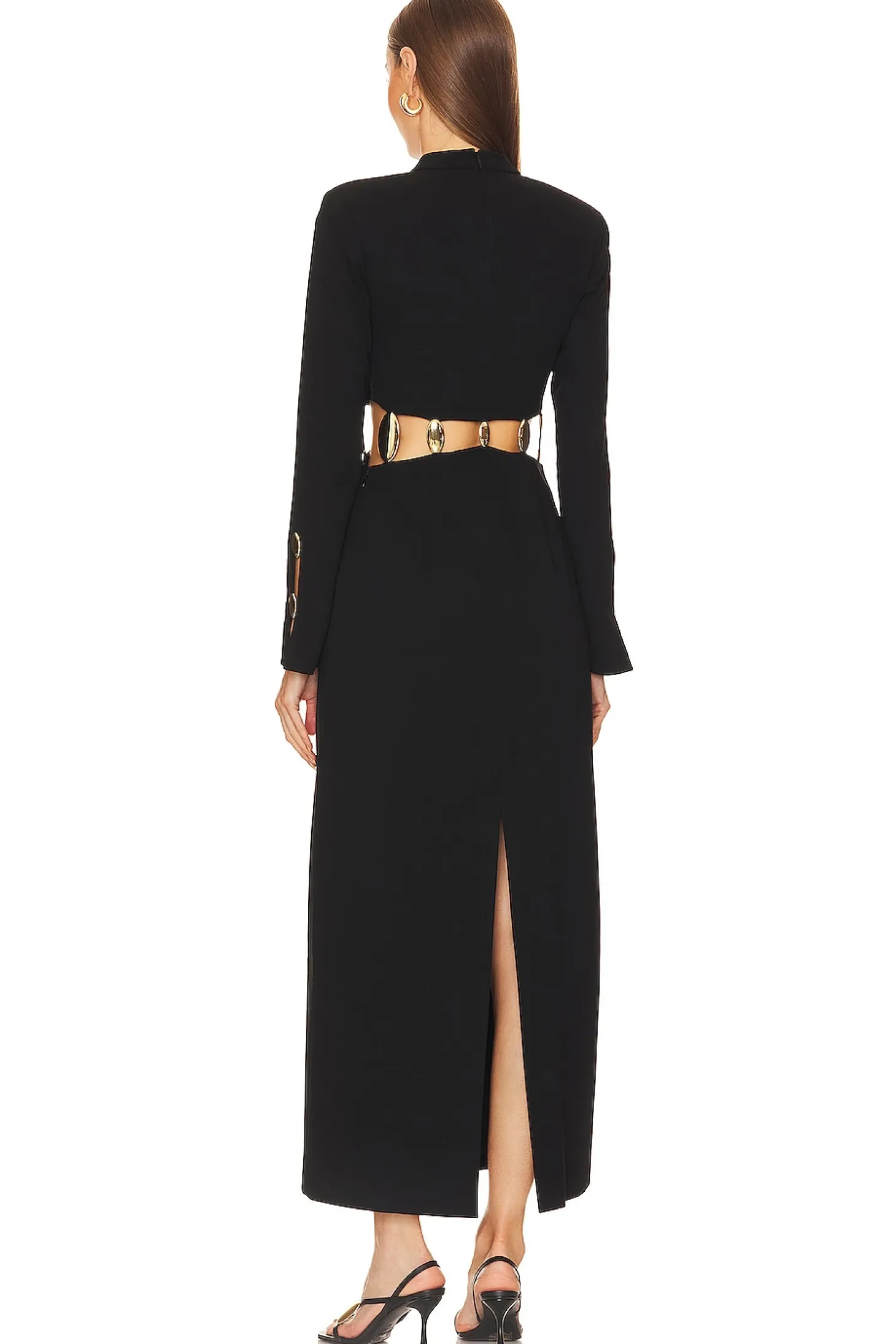 Self: 70% acetate 30% polyester Lining: 100% polyester.Made in China.Dry clean only.Fully lined.Partial hidden back zipper closure.Sleeve and bodice cut-outs with gold-tone metal accents.Ponte fabric with back vent