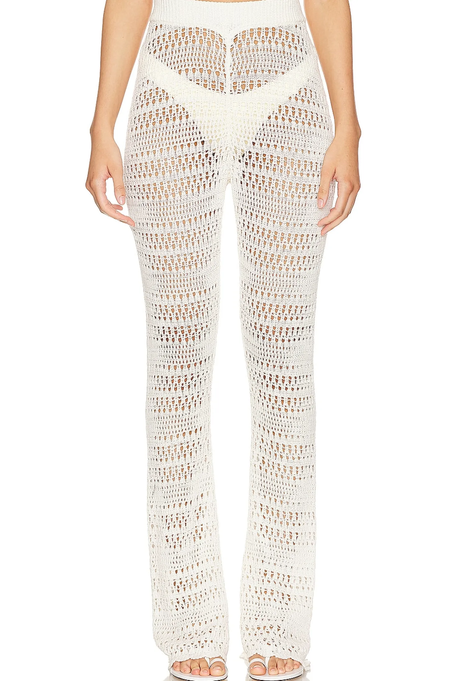 100% cotton.Made in China.Hand wash.Elastic waistband.Open knit crochet fabric with scallop hem.Item not sold as a set.12" at the knee breaks to 14" at the leg opening