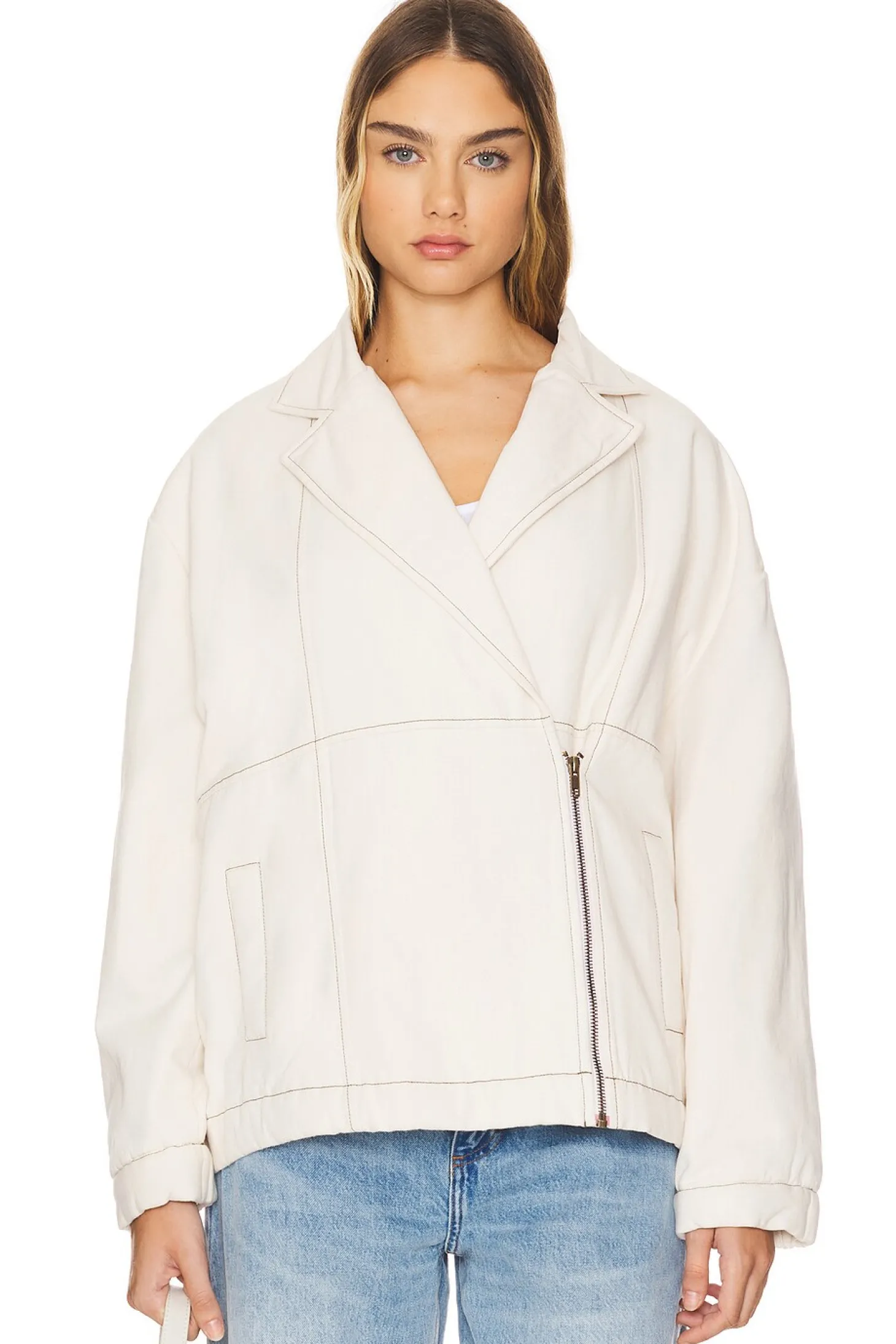 Twill textile.Imported.Machine wash recommended.Front asymmetrical zipper closure.Side seam pockets.Midweight padded twill fabric