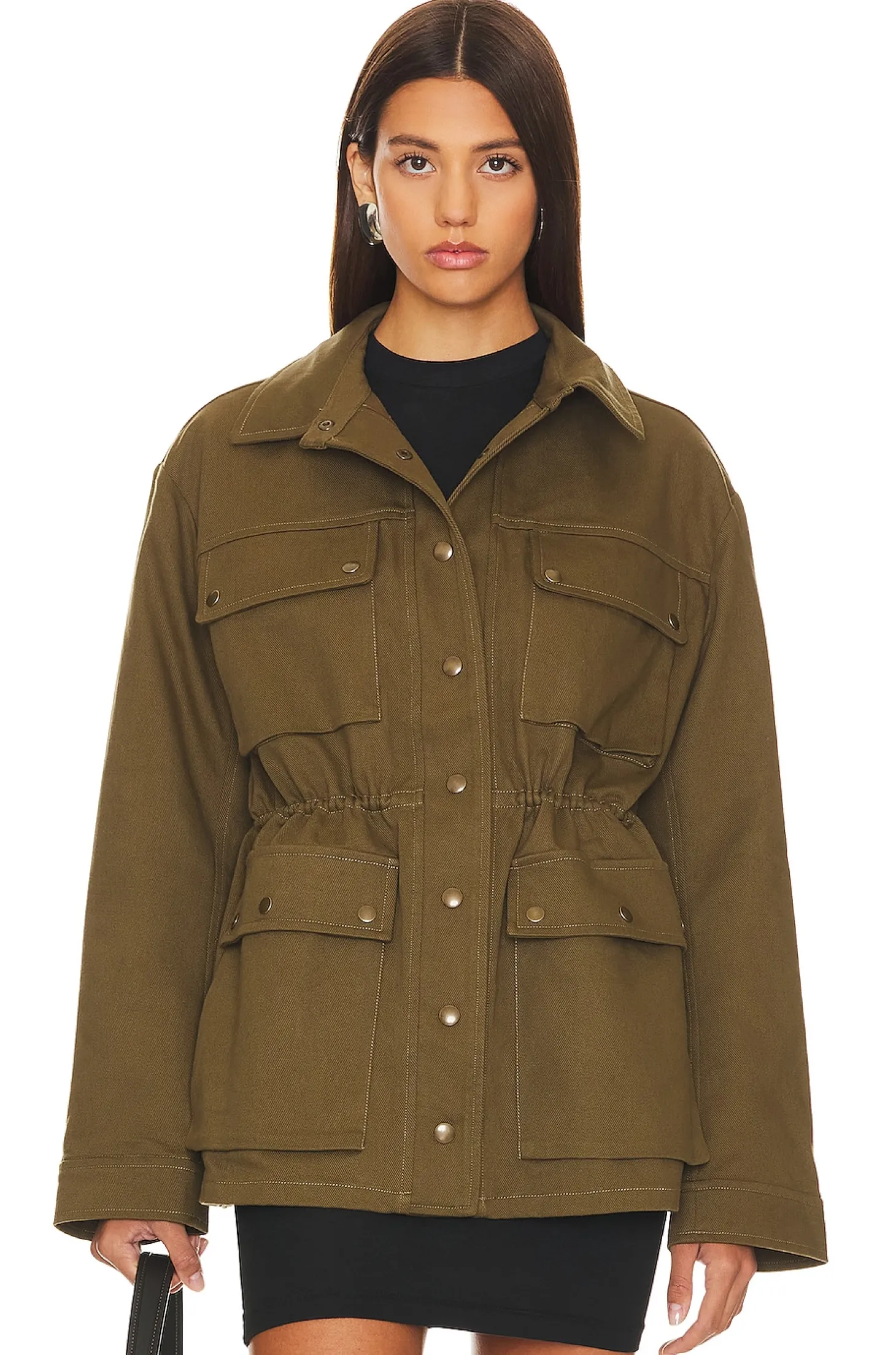 100% cotton.Made in China.Hand wash.Button down closure.Front flap pockets with button closures.Ruched waist with interior draw cords.Midweight denim fabric