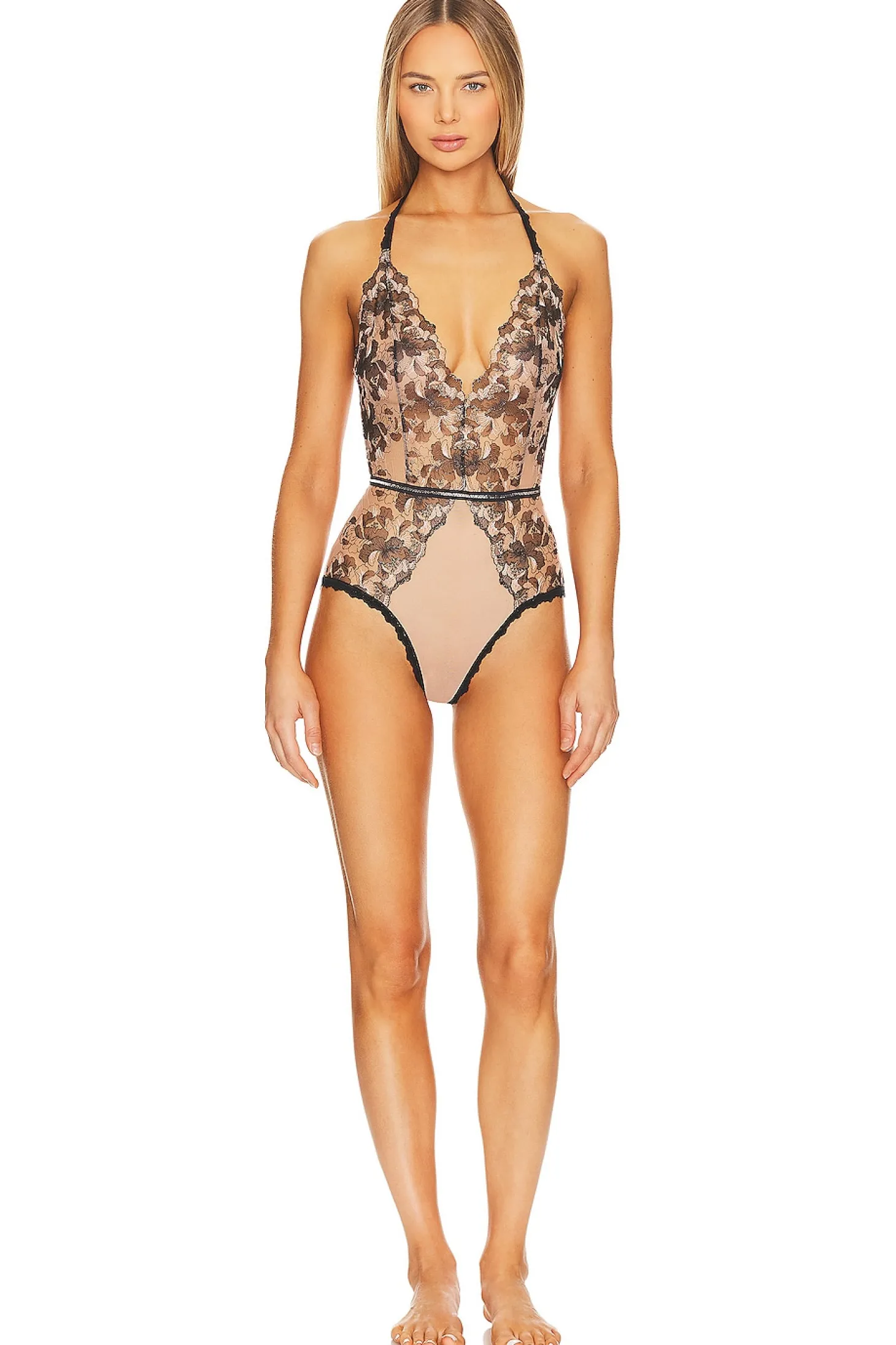 Self: 89% nylon 11% spandex Lace: 100% polyester Lining: 100% supima cotton.Made in USA.Hand wash.Halterneck clasp closure.Back hook and eye closure.Back keyhole.Lace fabric