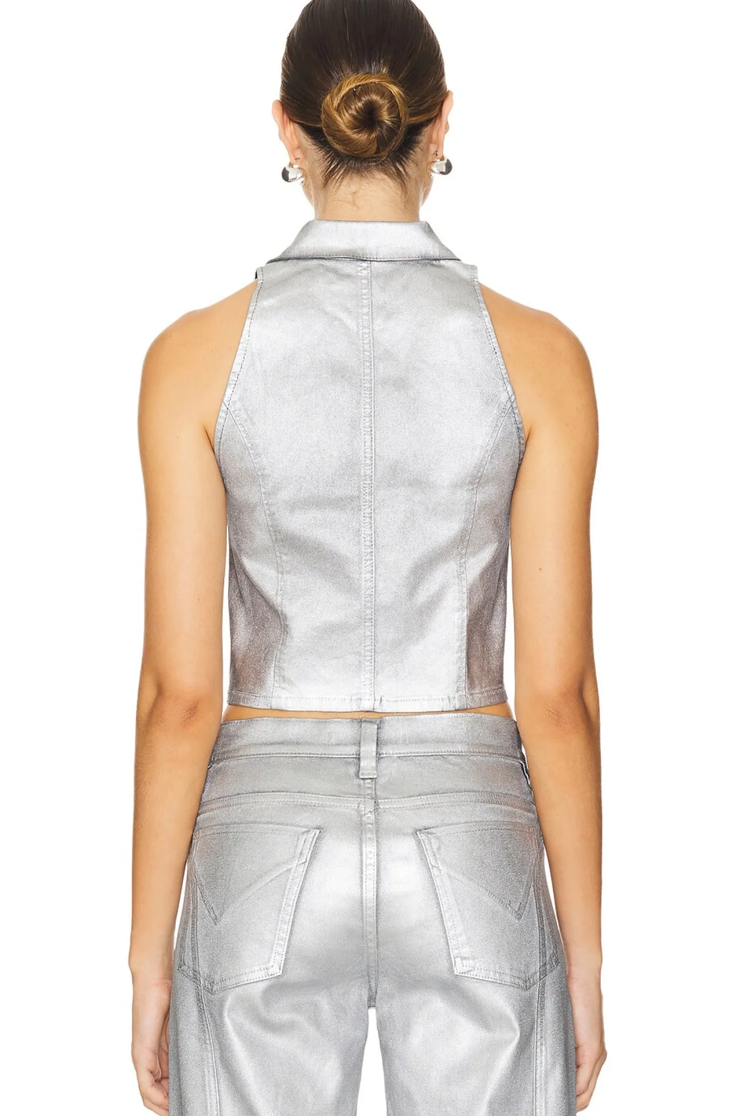 79% cotton 18% modal 3% elastane.Made in China.Dry clean only.Front button closure.Cropped fit.Metallic coated denim.Item not sold as a set