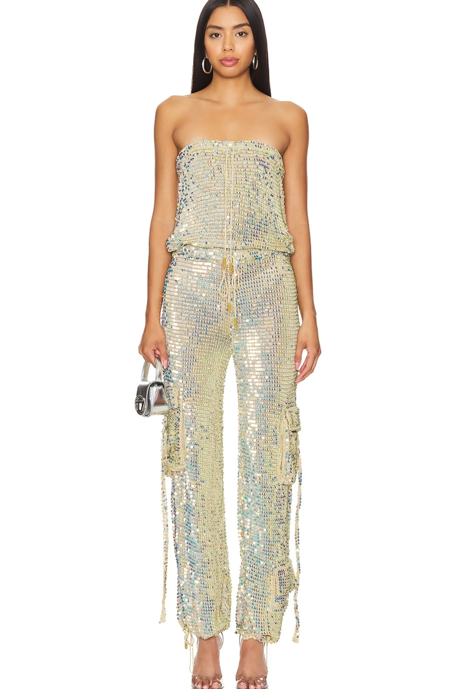 100% viscose.Made in India.Dry clean only.Neckline drawstring closure.Waist drawstring closure.Three cargo flap pockets.Sequined fabric.Neckline to hem measures approx 54" in length 20" at the knee and 20" at the leg opening