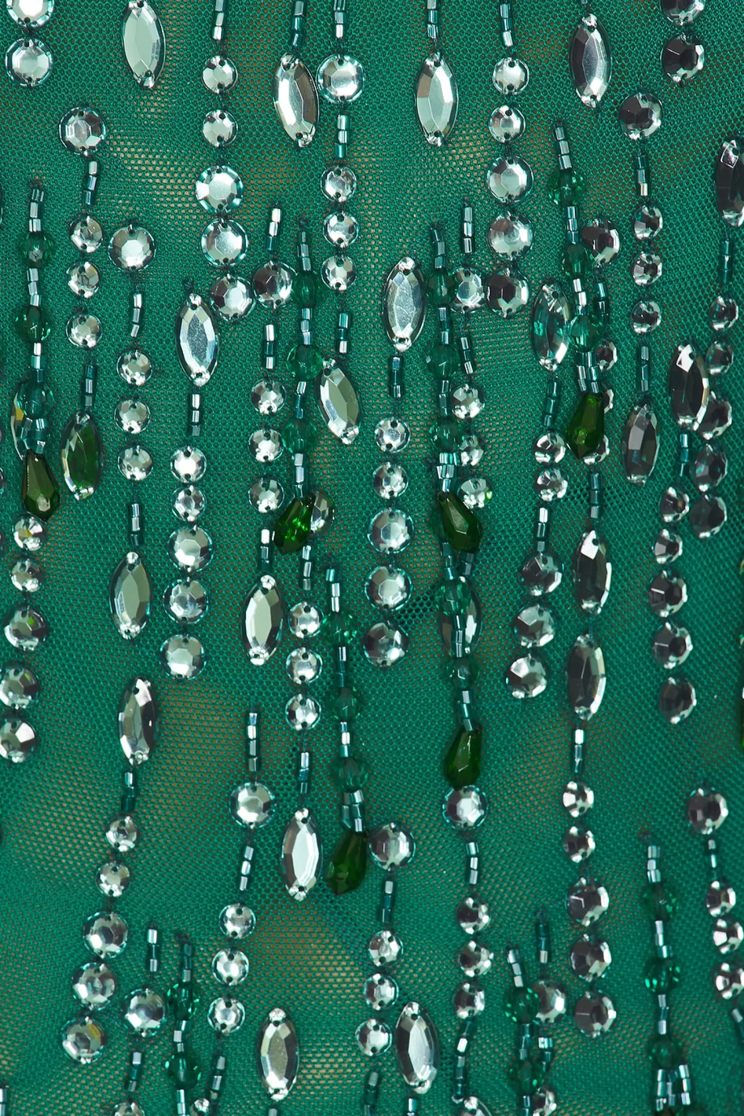 95% polyester 5% elastane.Made in Brazil.Hand wash.Unlined.Hidden back zipper closure.Self-tie halterneck.Sequin embellished mesh bodice and tulle skirt