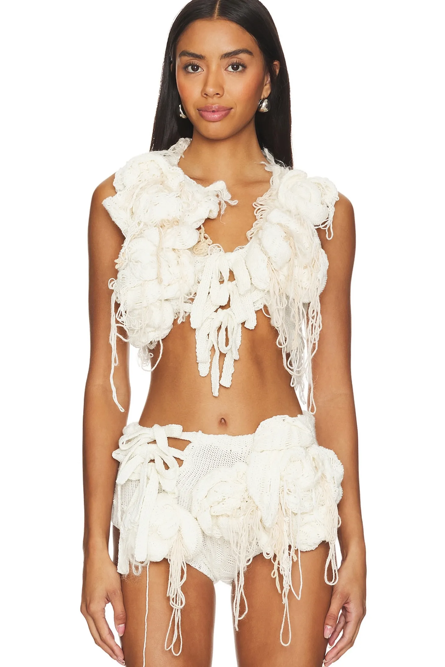 80% cotton 20% acrylic.Made in the United Kingdom.Hand wash.Front tie closure.Rosette embellishment with draped knit.Midweight crochet knit fabric.Item not sold as set