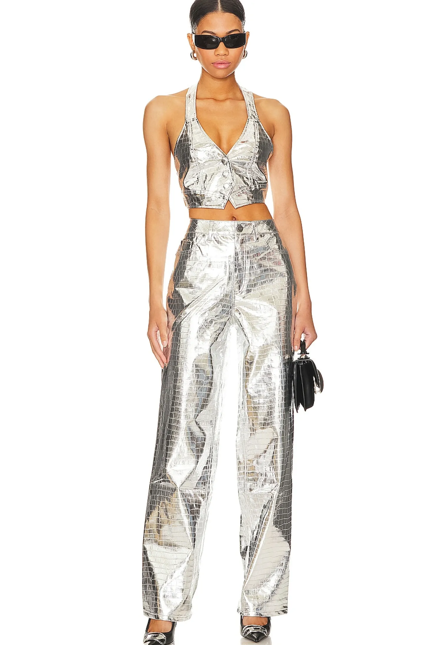 Self 1: 100% polyurethane Self 2: 100% rayon.Made in China.Machine wash.Front button closure.Halterneck styling.Embossed faux leather fabric with metallic finish.Item not sold as a set.AFRM's Harlan Vest is a cropped halter vest in a faux leather croc fabrication. This fun style is the perfect option for a concert.