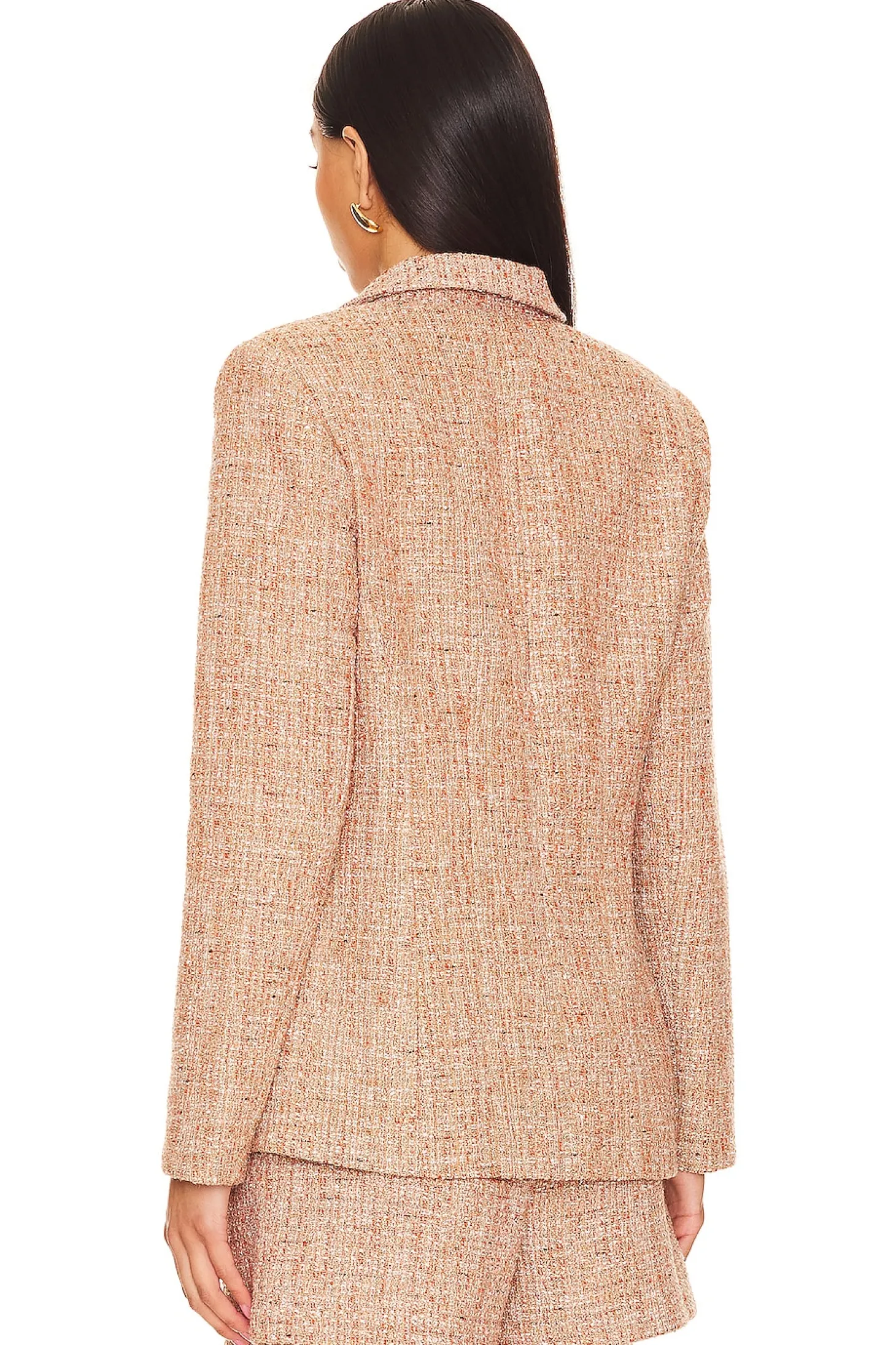 Self: 83% polyester 10% acrylic 7% other fibers Lining: 100% polyester.Made in China.Hand wash.Singular front button closure.Padded shoulders.Breast slip pocket and side flap pockets.Tweed fabric Item not sold as set