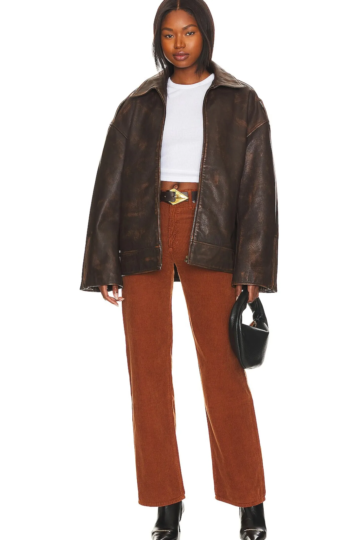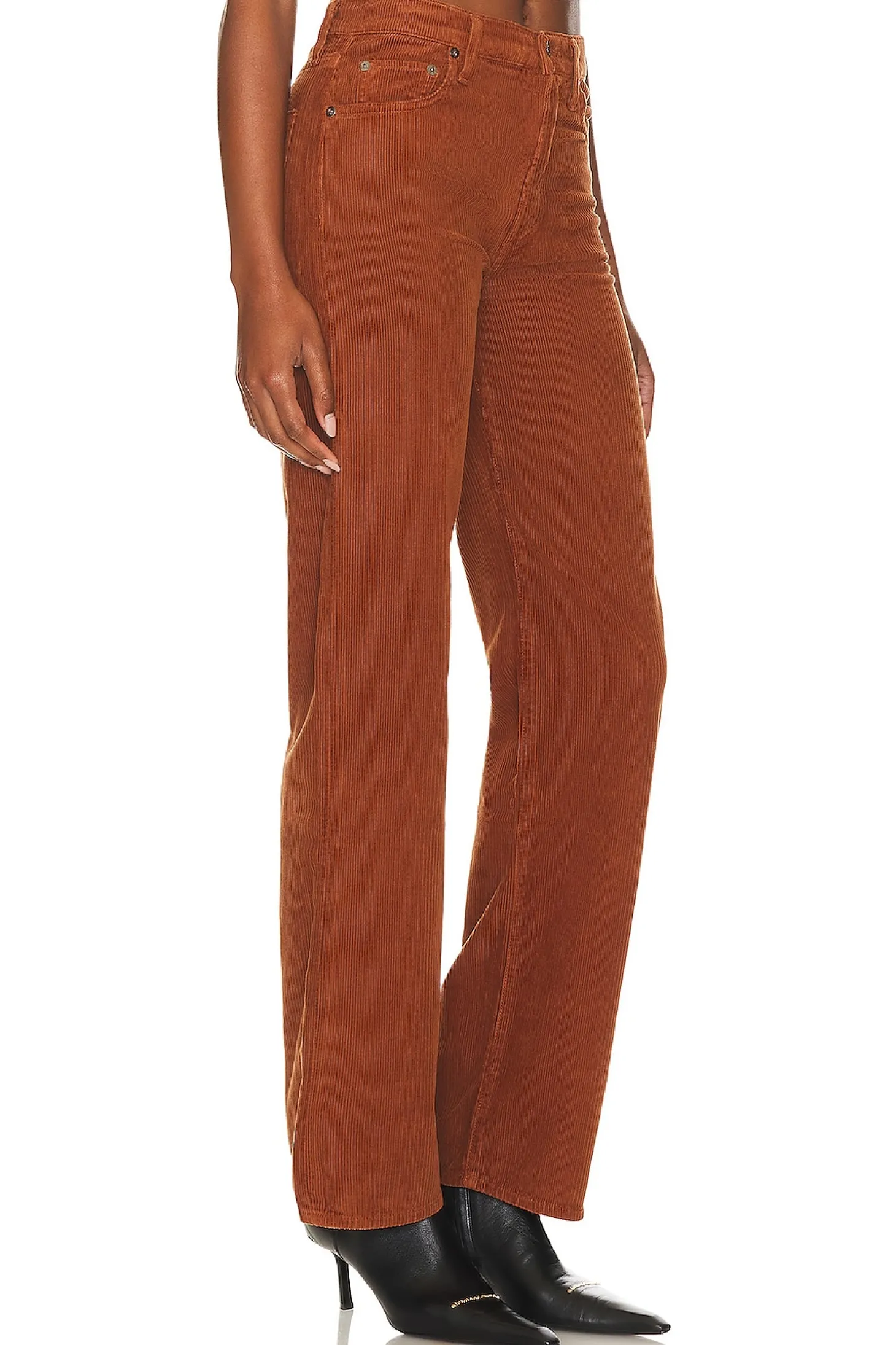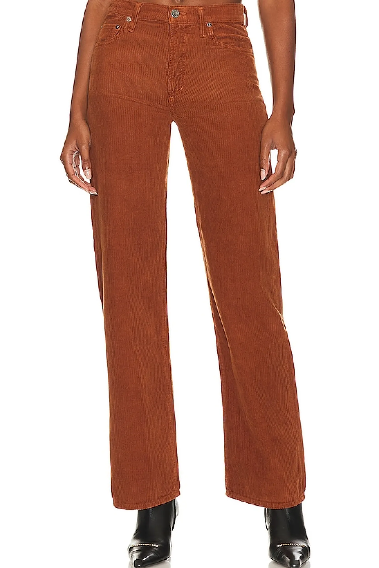 AGOLDE's Harper Mid Rise Wide Straight in Saddle Corduroy – Embrace fall in style. Zip fly, 5-pocket design and corduroy fabric in a warm rust color. Pair with a cozy sweater or leather jacket for the perfect autumn look..98% cotton 2% elastane.Made in USA.Machine wash.Zip fly with button closure.5-pocket styling.Corduroy fabric.18" at the knee and 18" at the leg opening