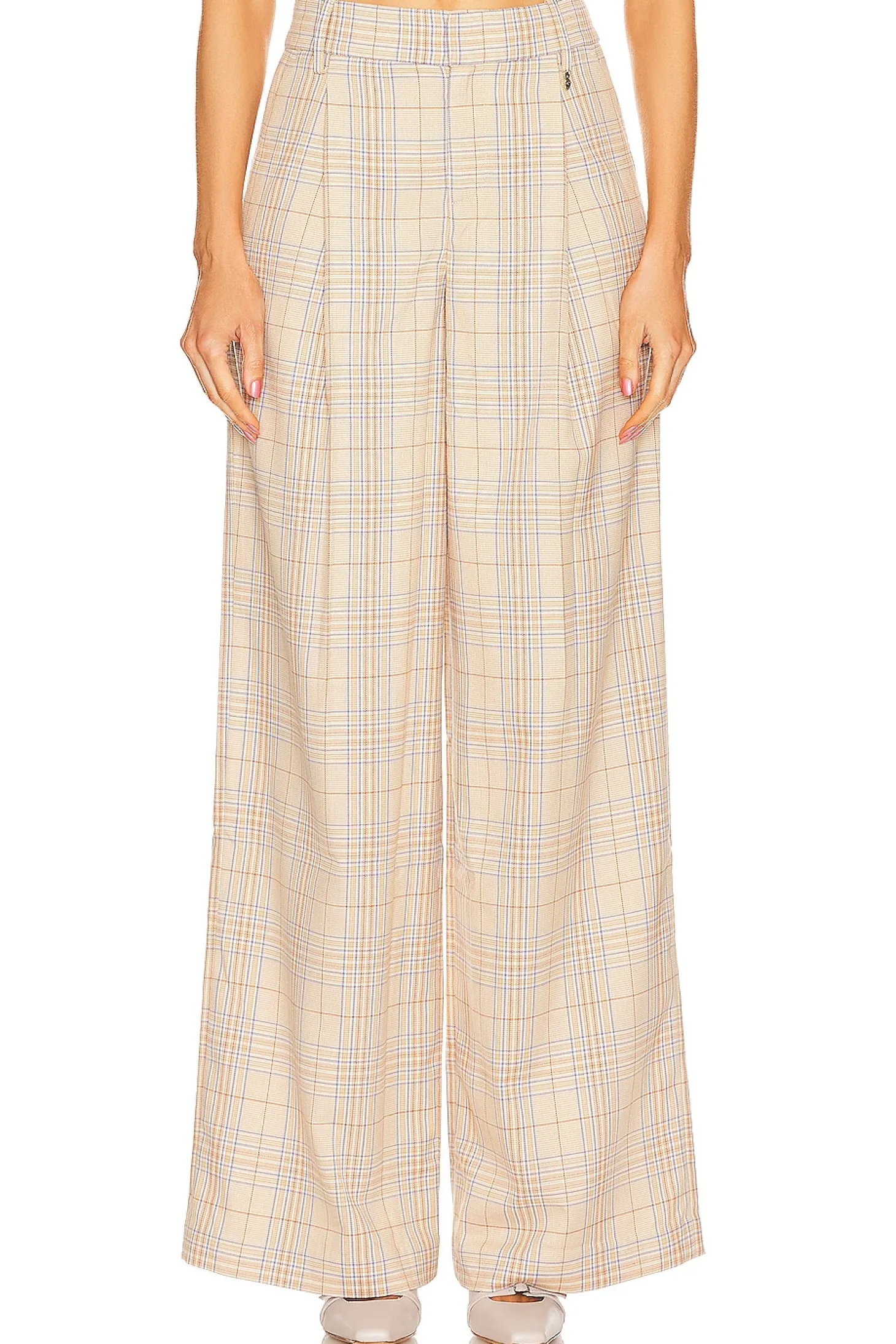 Self: 65% polyester 33% rayon 2% elastane Contrast Fabric: 100% polyester.Made in China.Dry clean only.Zip fly with hook and bar closure.3-pocket design.Front pintuck detail.Item not sold as a set.22" at the knee and 22" at the leg opening