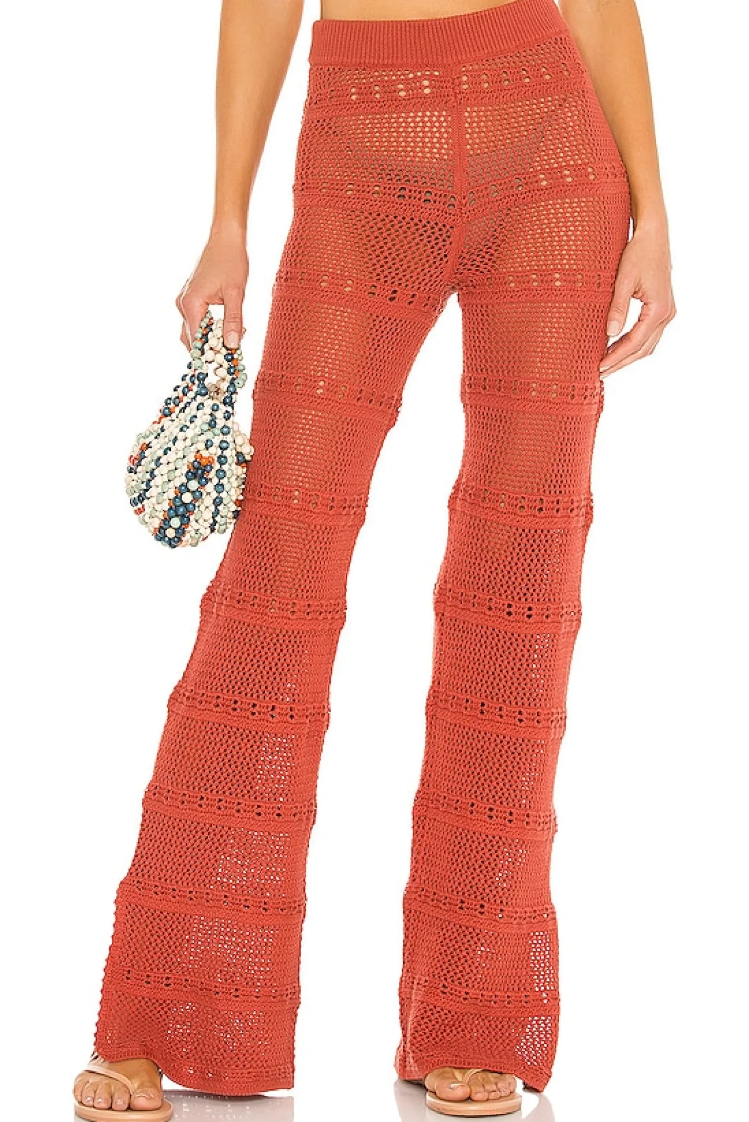 100% cotton.Made in China.Hand wash.Pull-on styling.Open knit crochet fabric.Item not sold as set.15" at the knee breaks to 20" at the leg opening