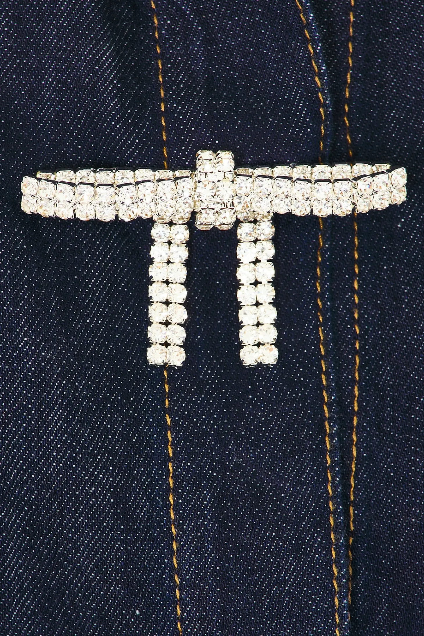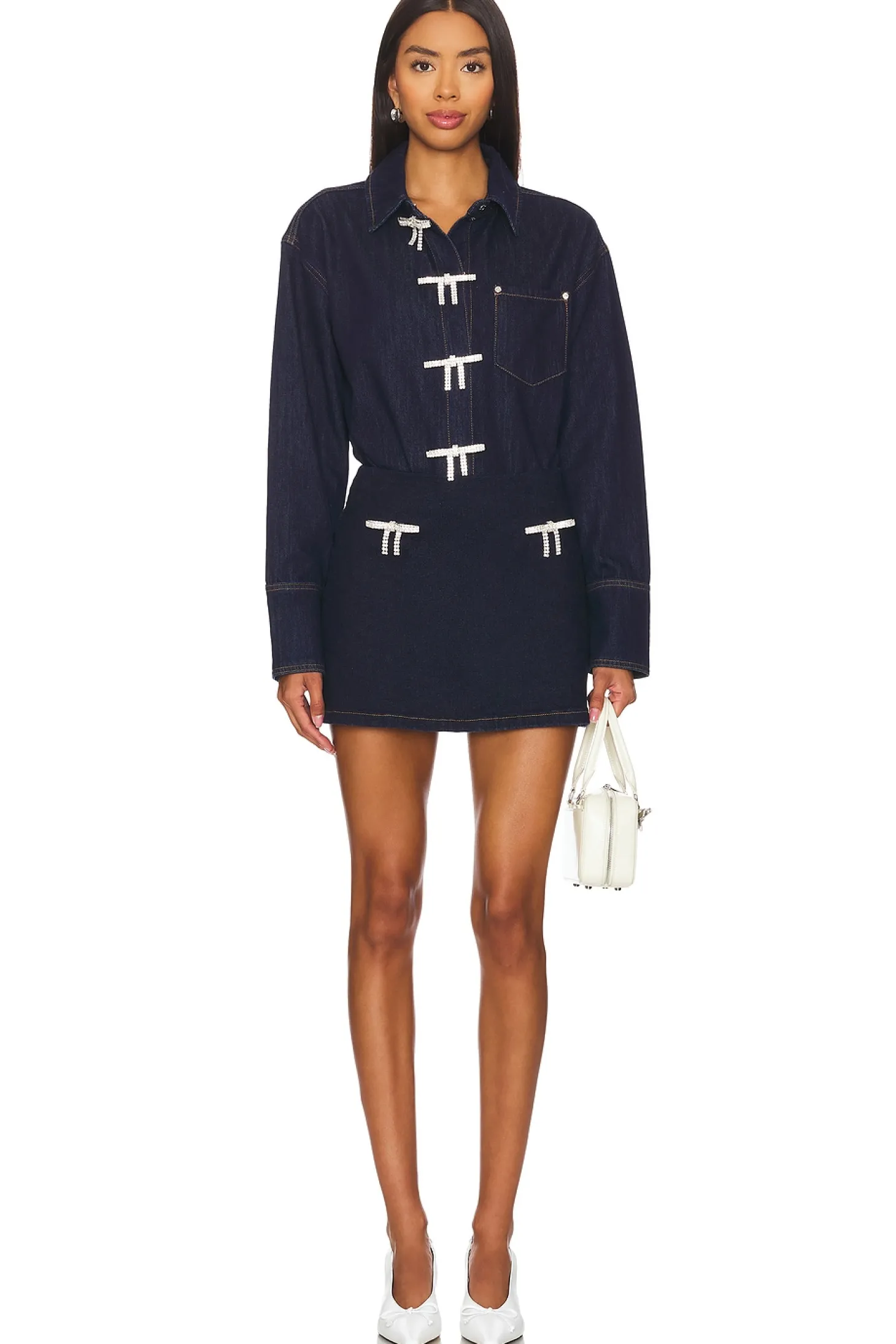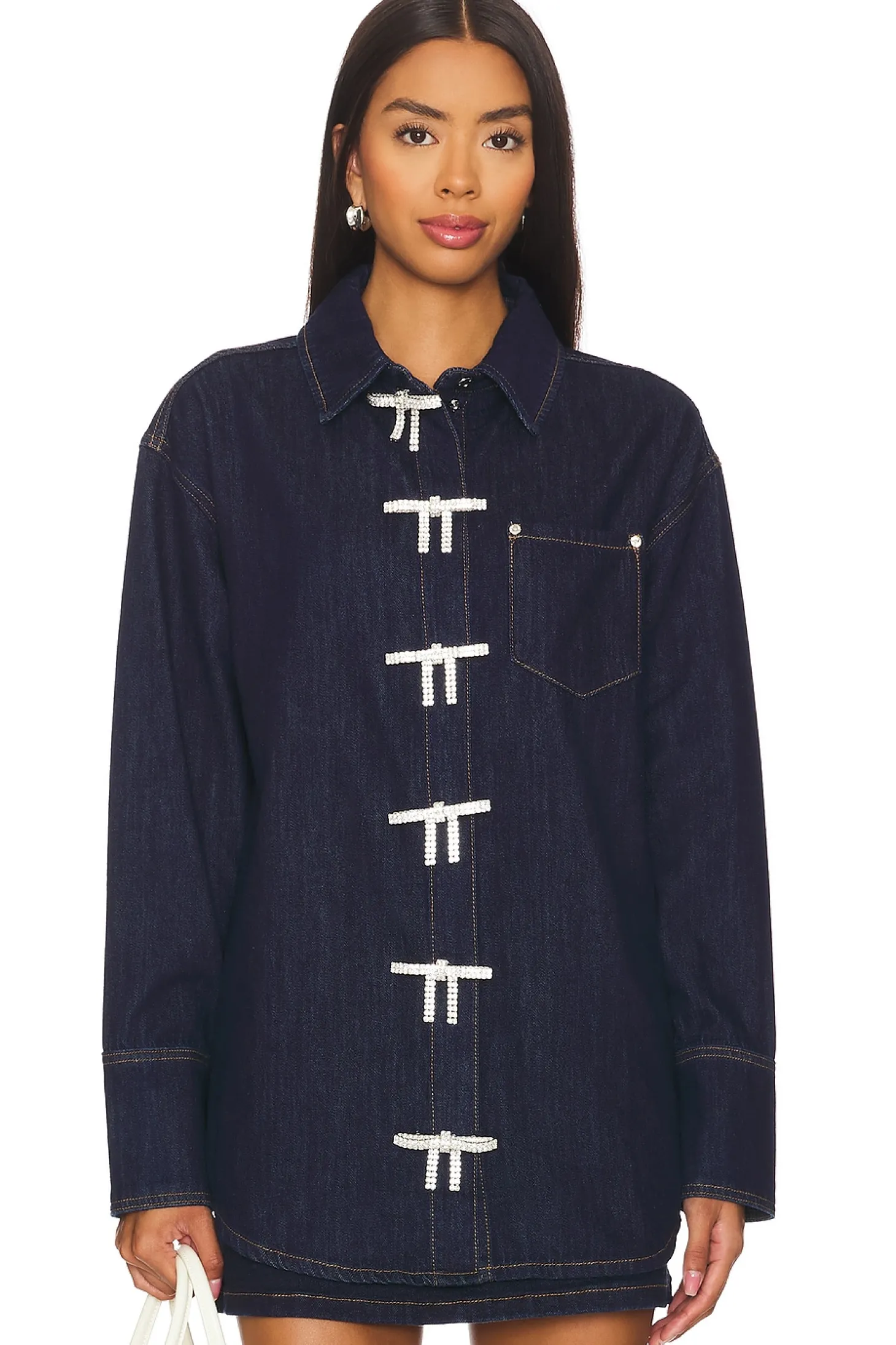 100% cotton.Made in China.Hand wash.Front snap button closure with crystal embellished bows.Breast slip pocket.Button cuffs.Lightweight denim fabric