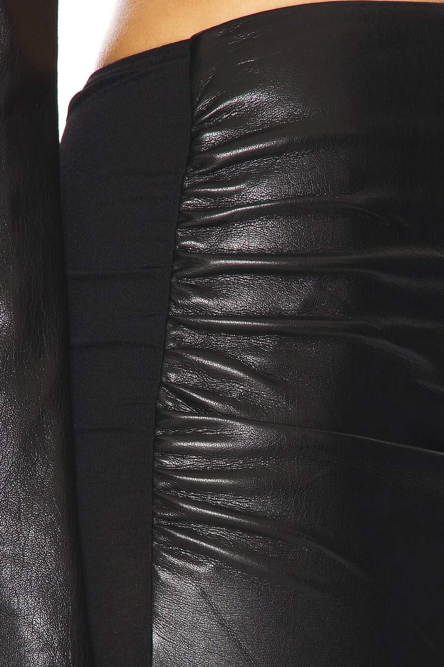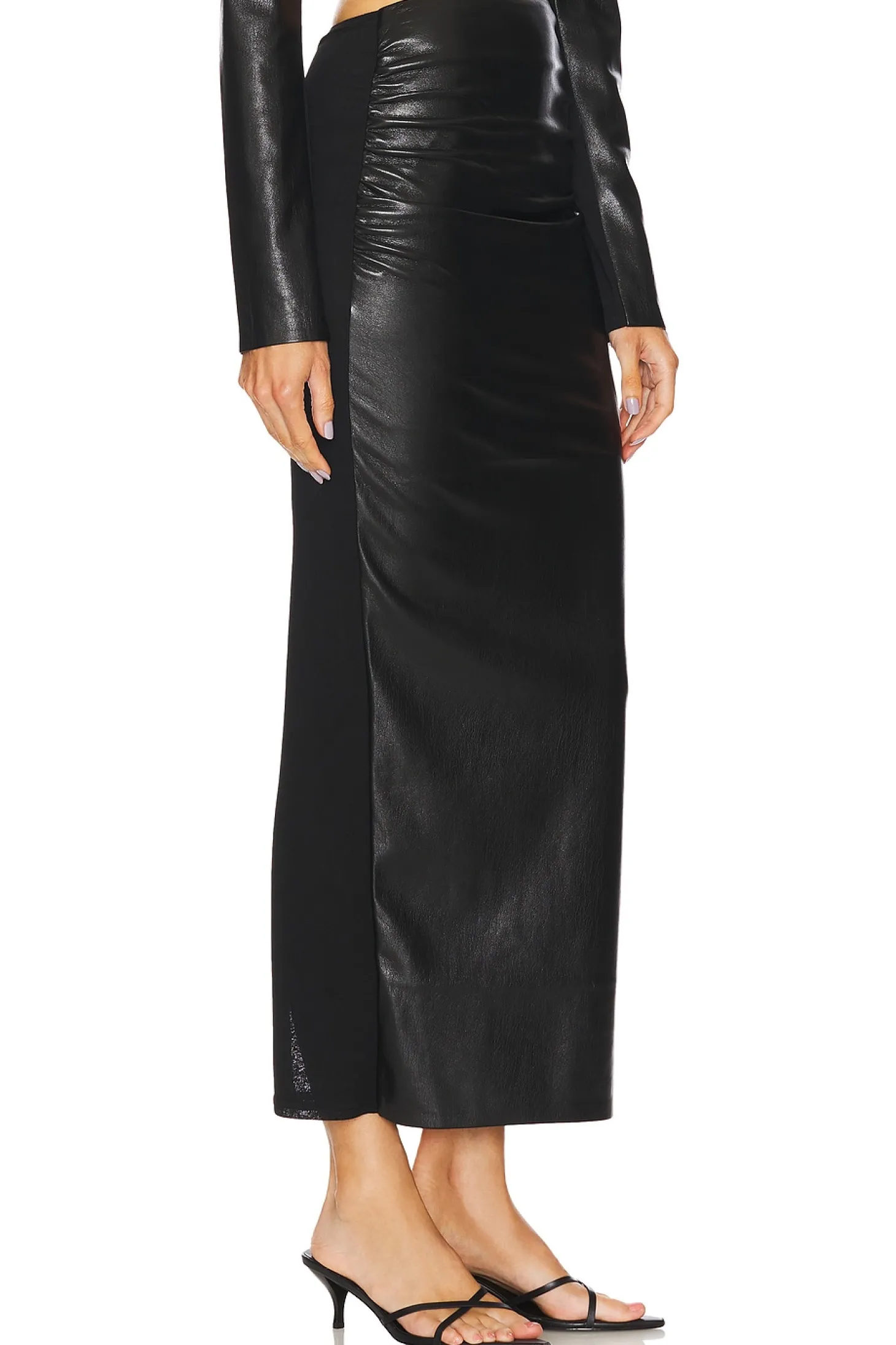 Self 1: 100% polyurethane Self 2: 100% polyester Lining: 100% polyester.Made in China.Dry clean.Fully lined.Hidden side zipper closure.Ruched faux leather design at front with slinky knit contrast at back.Back vent detail Item not sold as set.Skirt measures approx 39" in length