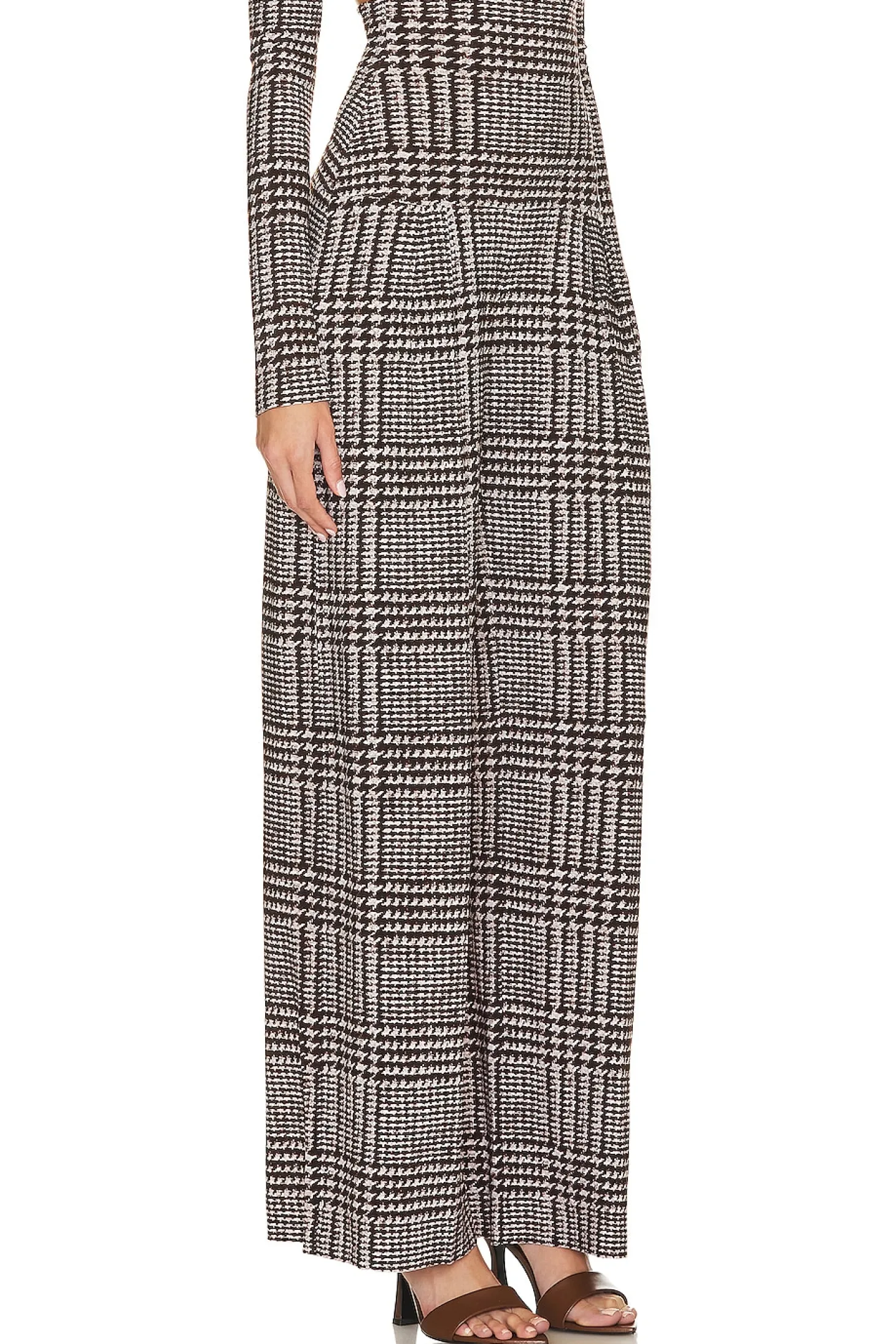 Step into autumn with style in Norma Kamali's Chocolate Glenn Plaid Tweed High Waist Pleat Pant. These high-waisted, wide-leg pants are the perfect essential for a chic fall wardrobe, just in time for pumpkin season..95% polyester 5% spandex.Made in China.Machine wash.Pull-on styling with wide stretch waistband.Lightweight slinky jersey fabric.Item not sold as a set.23" at the knee and 23" at the leg opening.style runs large, size down
