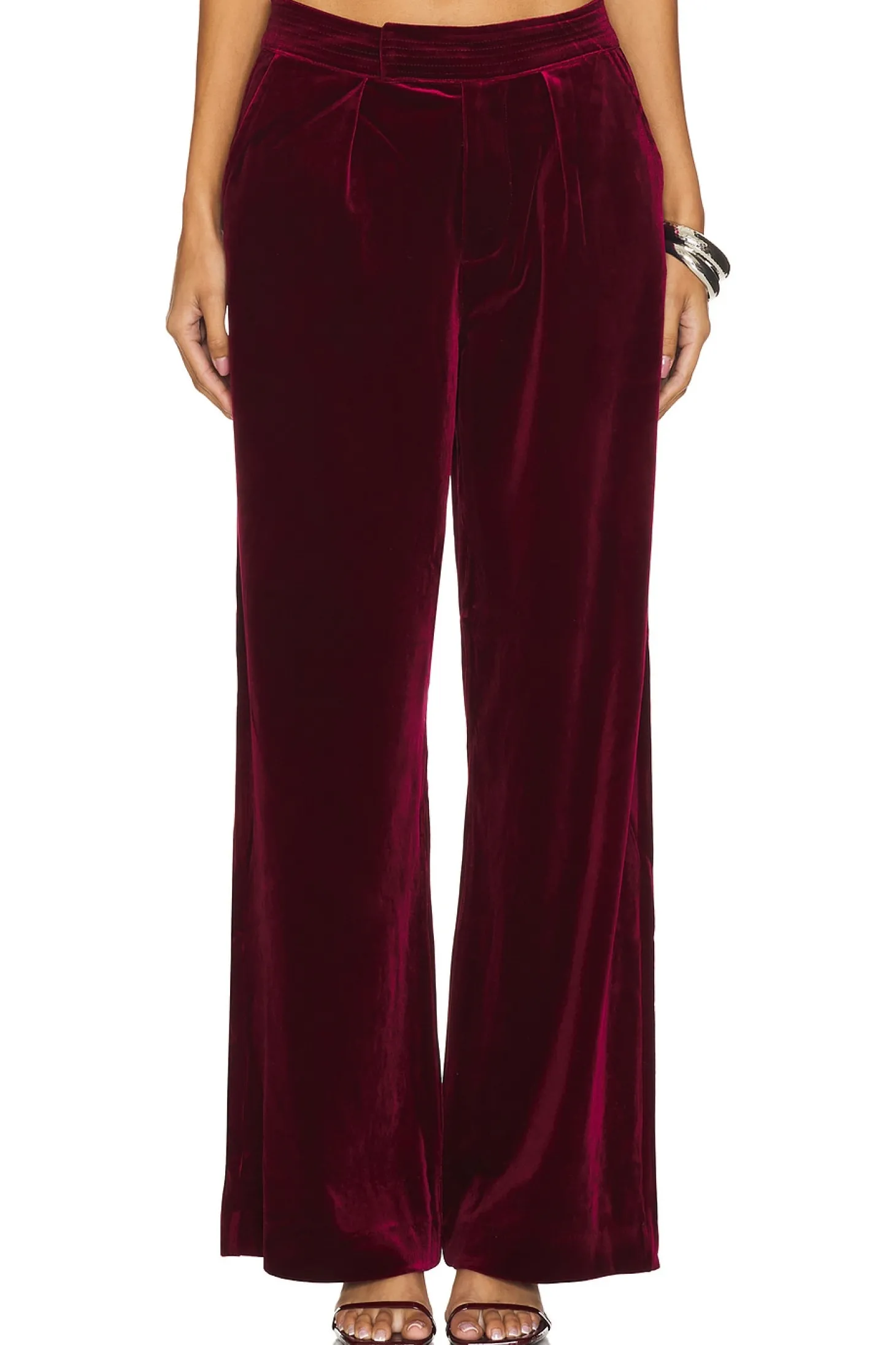 95% polyester 5% spandex.Made in China.Dry clean only.Fly zip with snap closure.Side seam pockets and back faux welt pockets.Heavyweight velvet fabric Item not sold as a set.24" at the knee narrows to 22" at the leg opening
