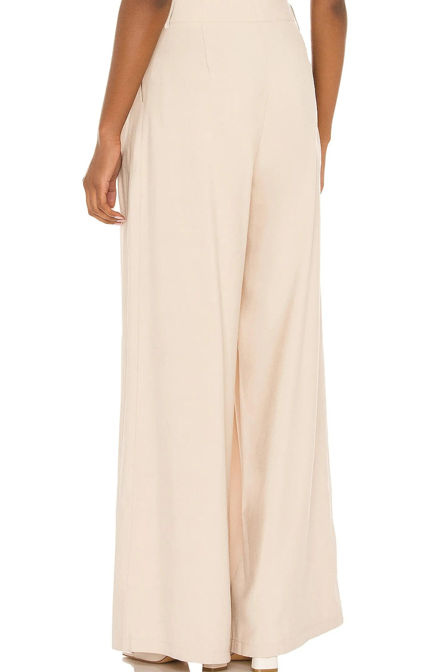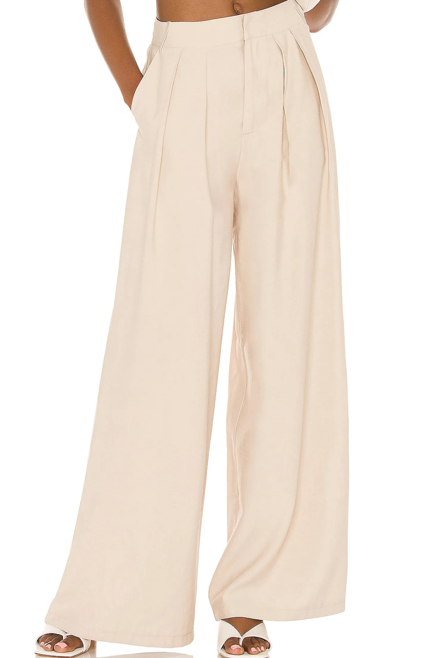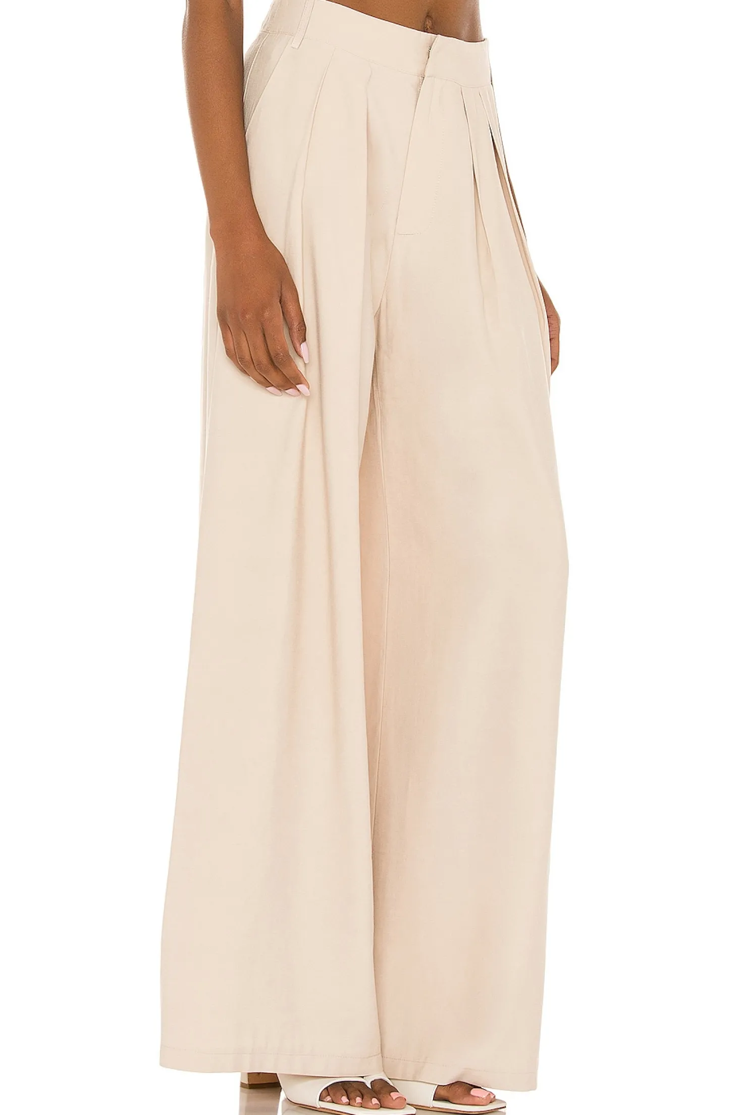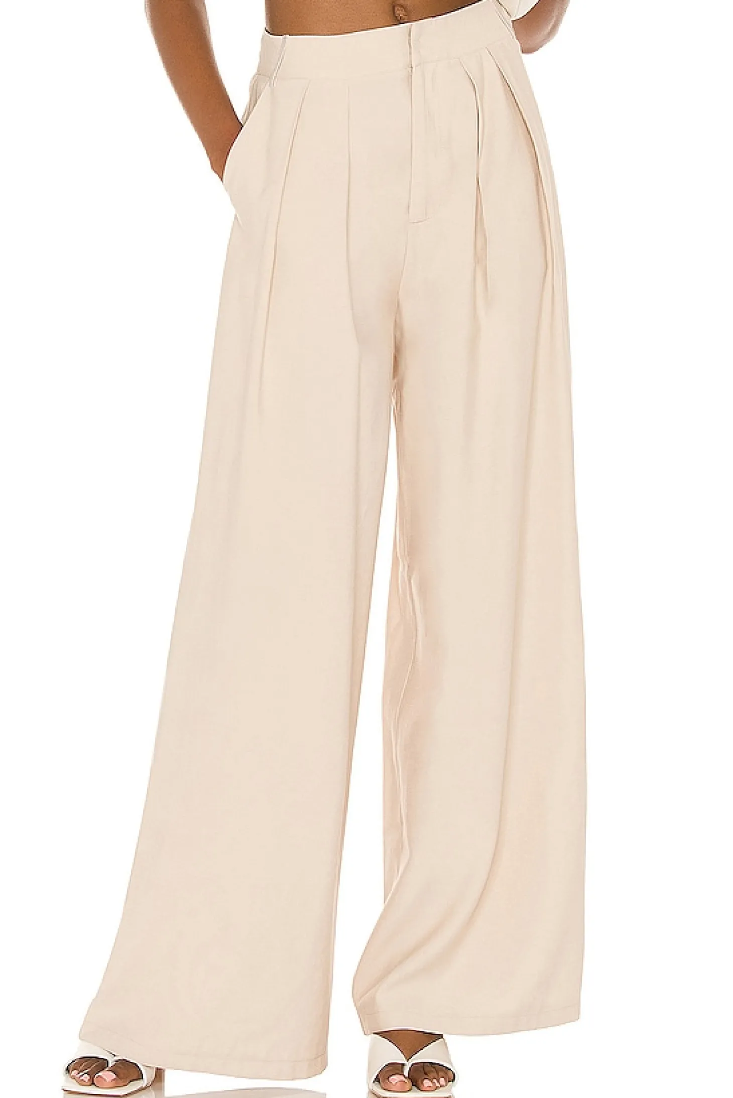95% rayon 5% poly.Made in China.Hand wash.Zip fly with hook and bar closure.Side seam pockets.Pleated detail.Linen fabric.26" at the knee breaks to 29" at the leg opening