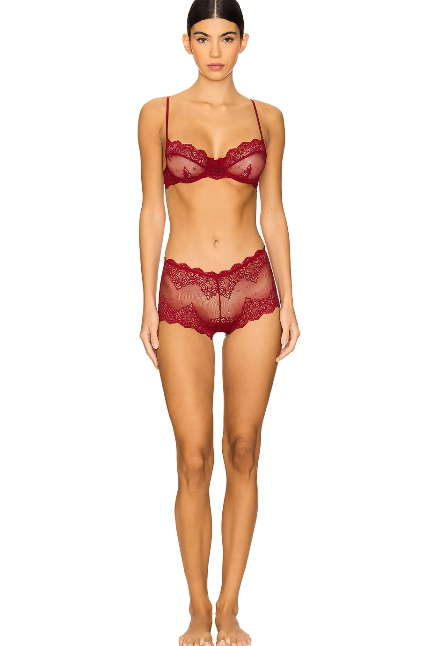 88% nylon 12% spandex.Made in USA.Hand wash.Pull-on styling with elastic waistband.Lace fabric.Item not sold as set