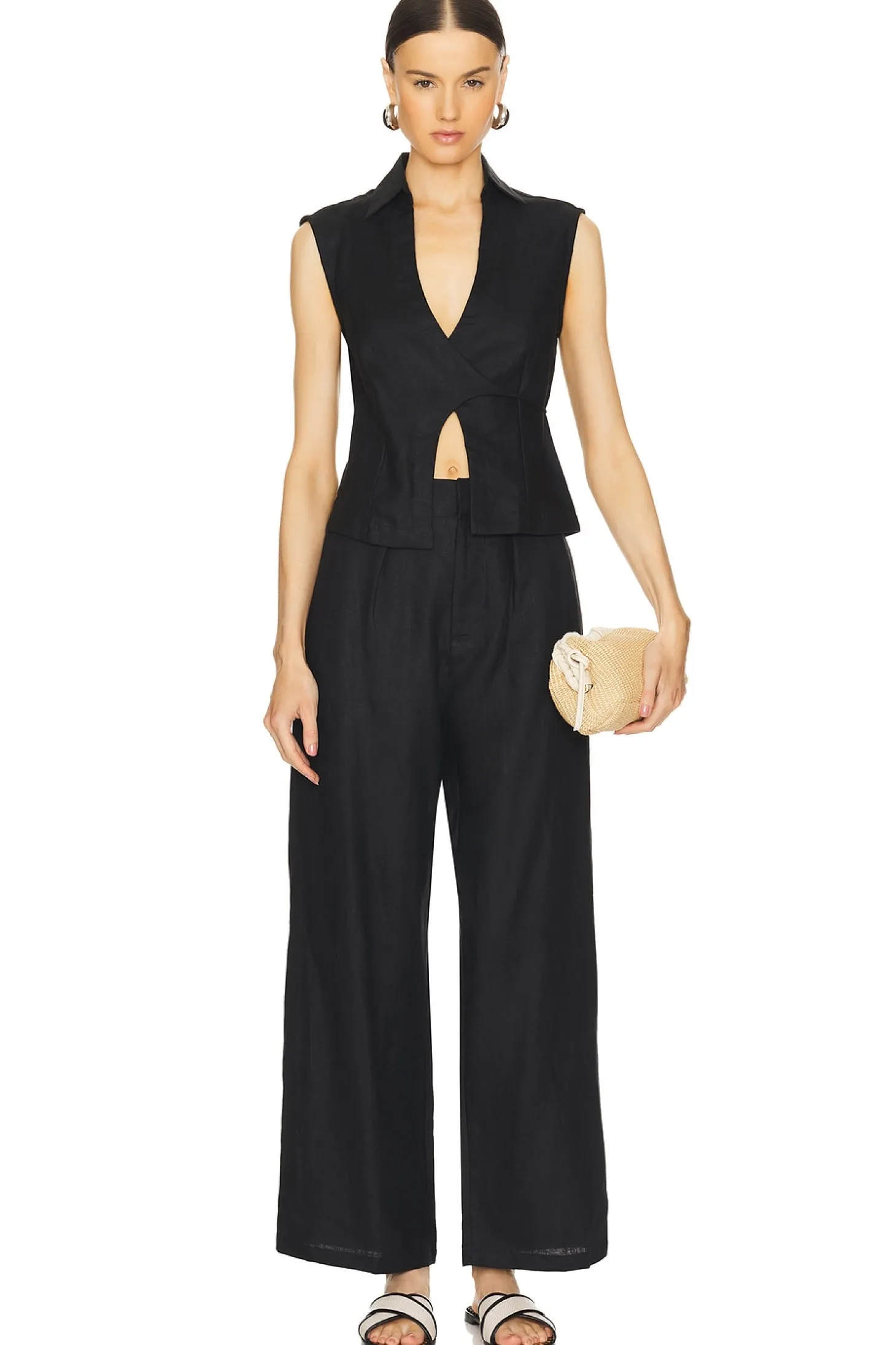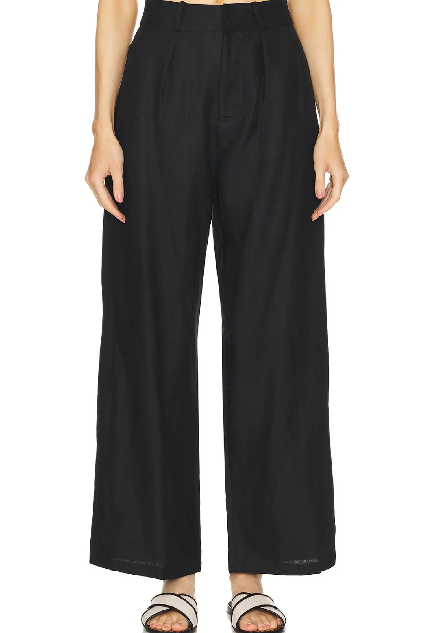 100% linen.Made in Indonesia.Hand wash.Zip fly with hook and bar closure.Side seam pockets.Linen fabric.Item not sold as set.22" at the knee and 22" at the leg opening